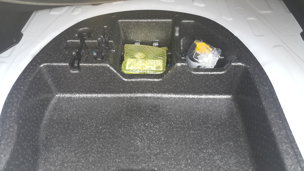 트렁크 바닥을 열어보니 예비타이어는 없고 타이어 응급장비만 들어있습니다.