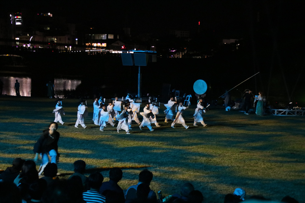 밀양강에는 오늘의 공연을 위하여 수상 무대가 설치되어 있습니다.
