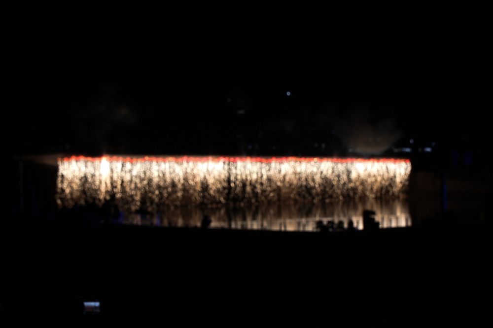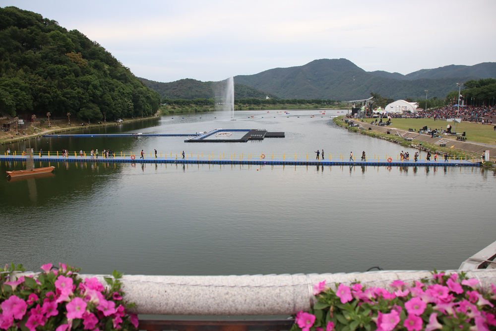 밀양강에는 오늘의 공연을 위하여 수상 무대가 설치되어 있습니다.