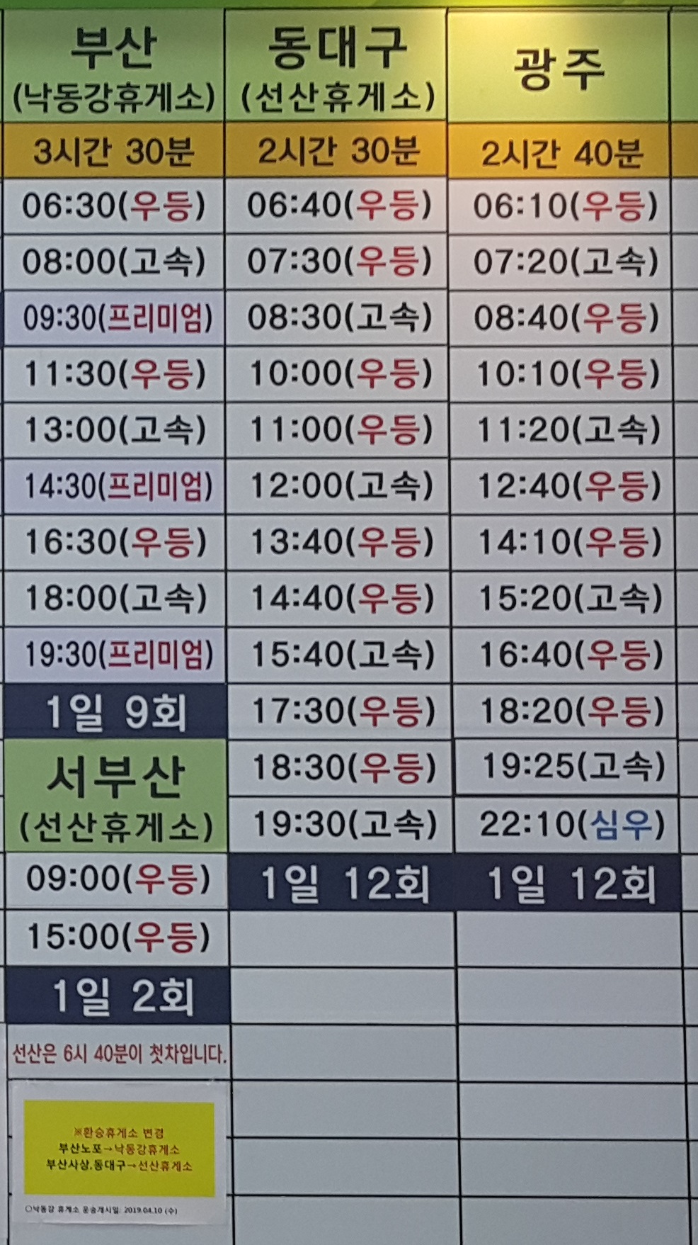 청주 출발 부산 (낙동강 휴게소), 서부산 (선산휴게소), 동대구 (선산휴게소), 광주 방면.