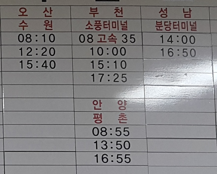 익산 출발 오산, 수원, 부천 소풍터미널, 안양, 평촌, 성남 분당터미널 방면.