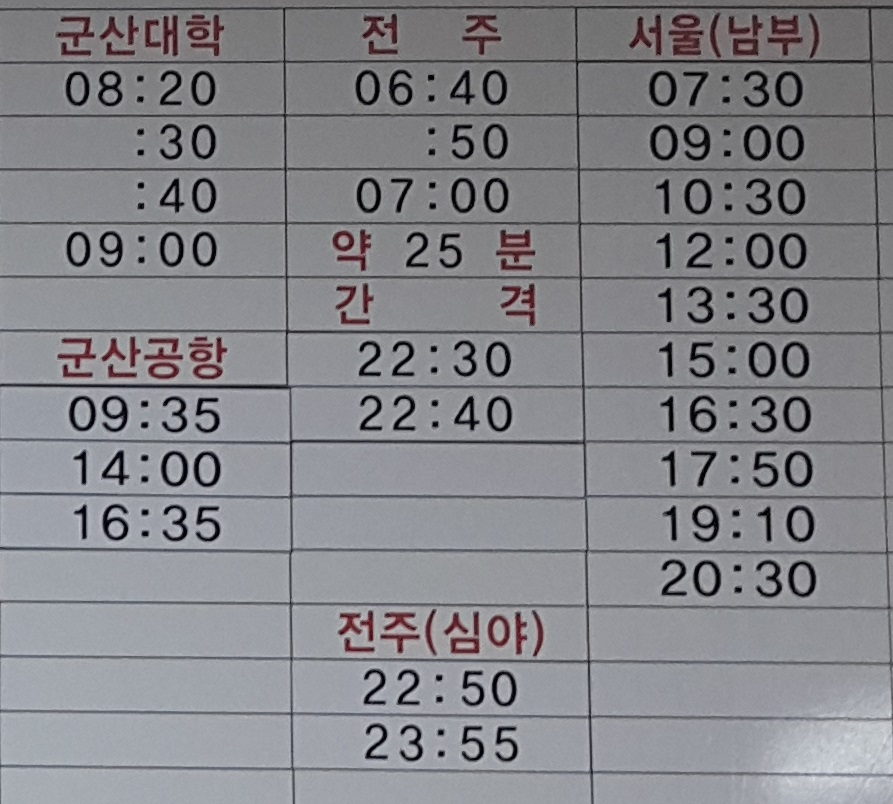 익산 출발 군산대학, 군산공항, 전주, 서울 남부 방면