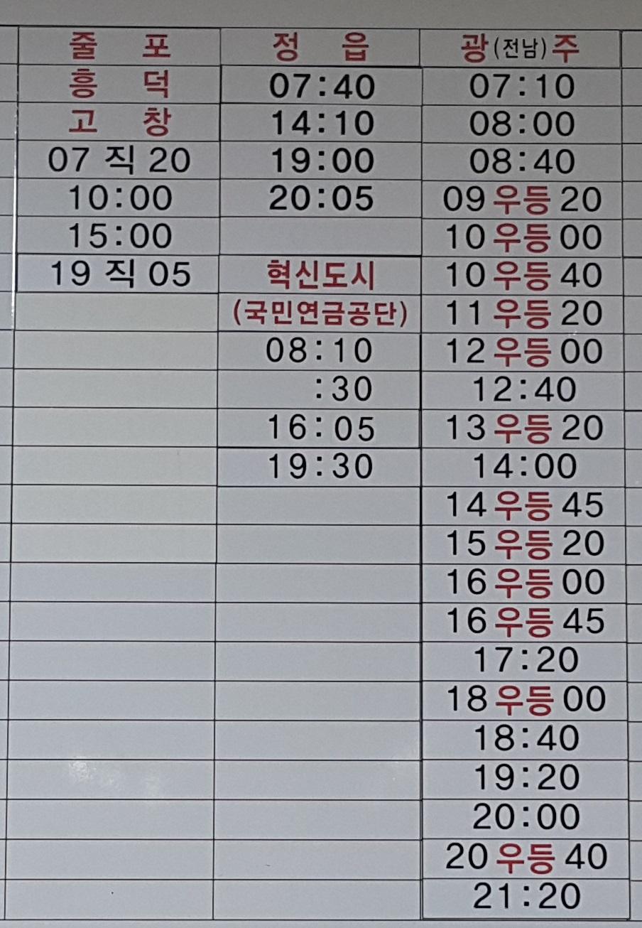 익산 출발 줄포, 흥덕, 고창, 정읍, 혁신도시(국민연금공단), 광주 방면.