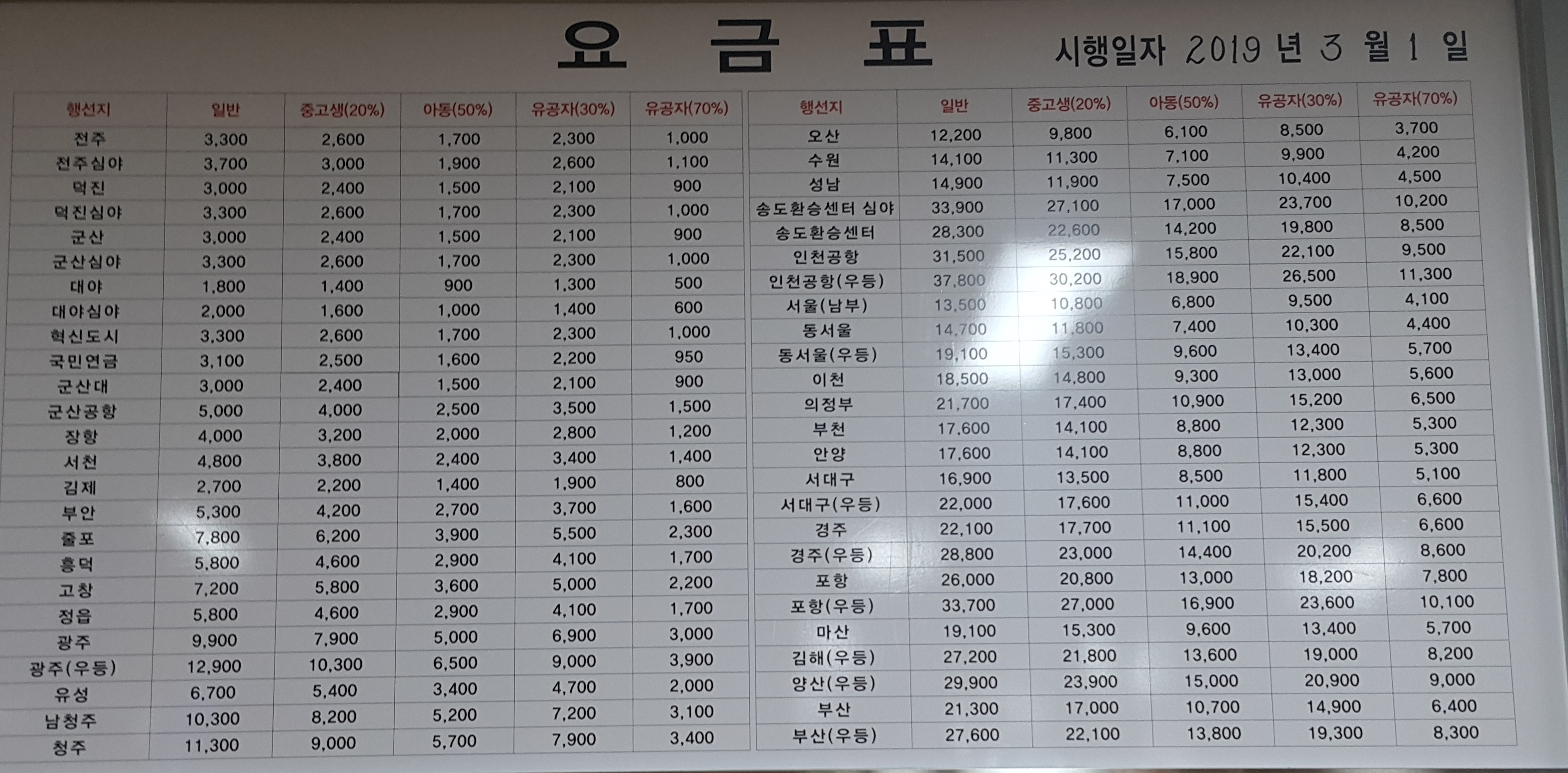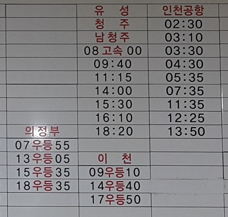 익산 출발 의정부, 유성, 청주, 남청주, 인천공항 방면.