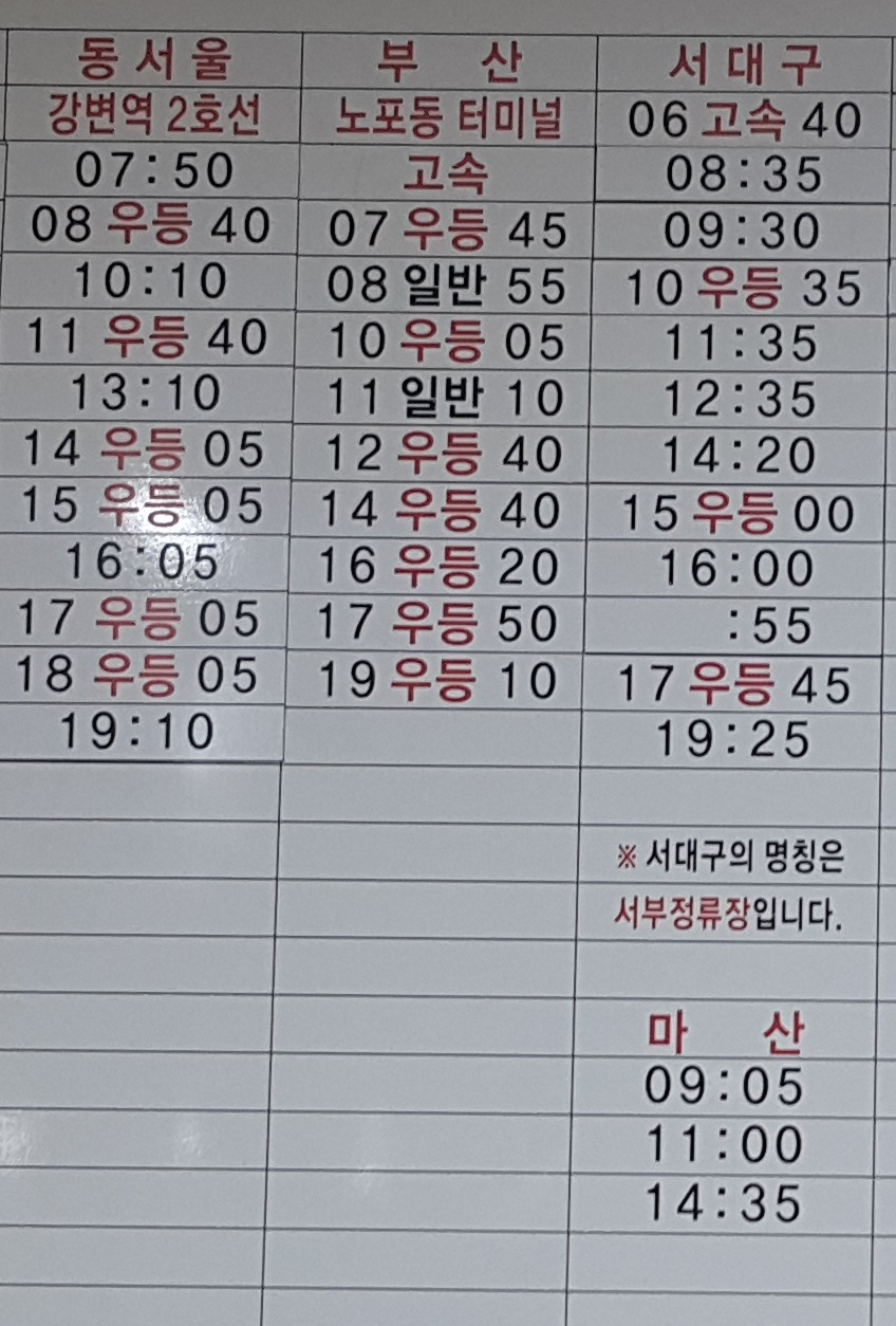 익산 출발 동서울 강변역 2호선, 부산 노포동 터미널, 서대구 서부정류장, 마산 방면.