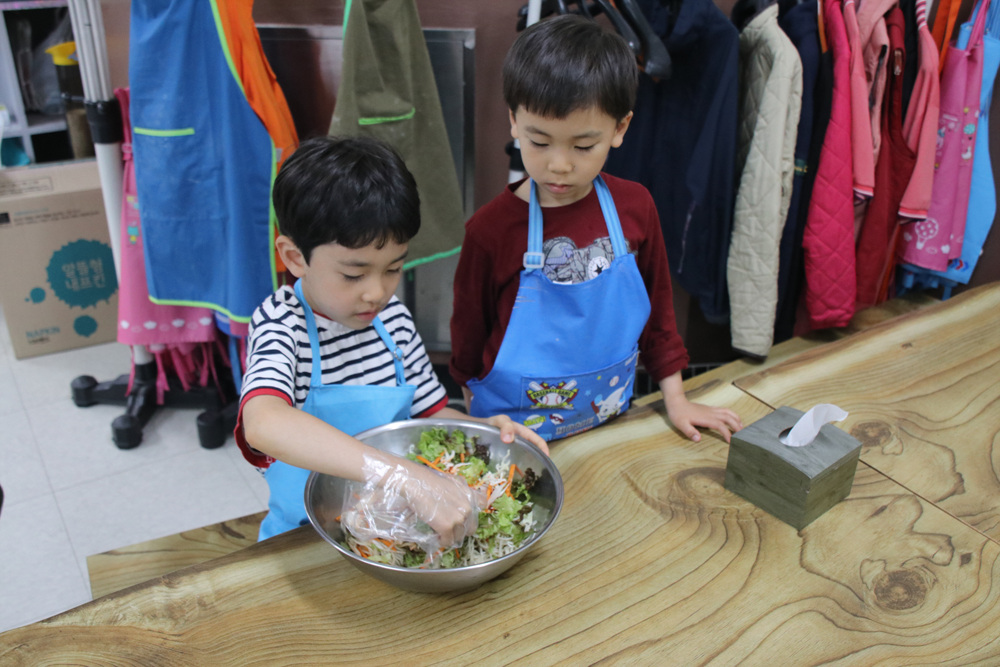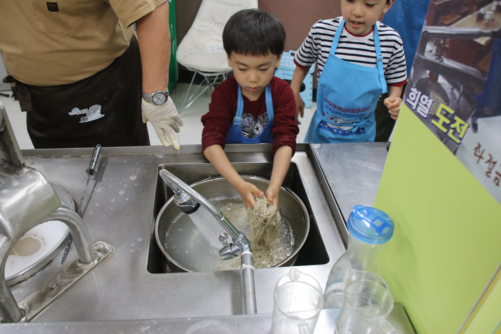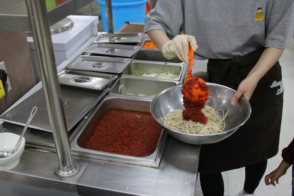 잘 씻은 면을 그릇에 담고 선생님에게 가져다주면 여러 가지 양념을 넣어주세요