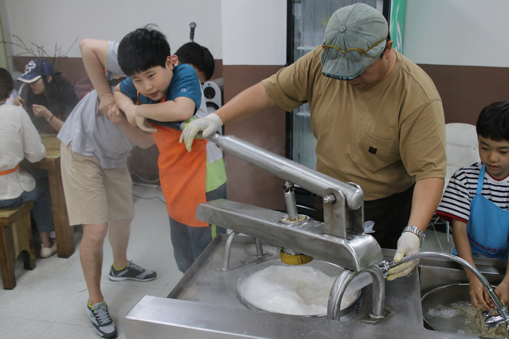 아빠와 아들이 면 뽑는 장비에서 힘차게 면을 뽑아내고 있습니다.