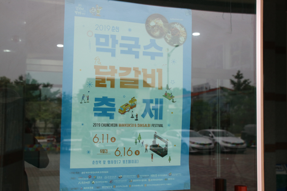 출입구에 2019 춘천 닭갈비막국수축제 포스터가 부착되어 있습니다.
