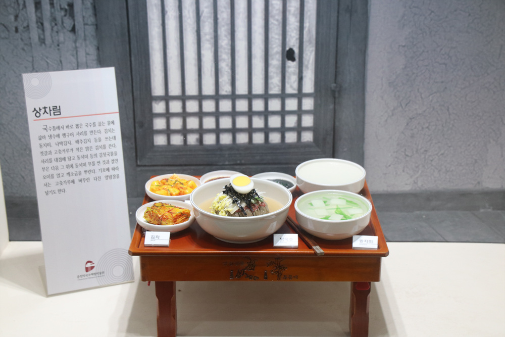 상차림을 모형으로 만들어 놓았는데 이러한 자료를 통하여 조금 더 정확하게 메릴을 이용한 막국수의 상차림을 잘 알 수 있습니다.