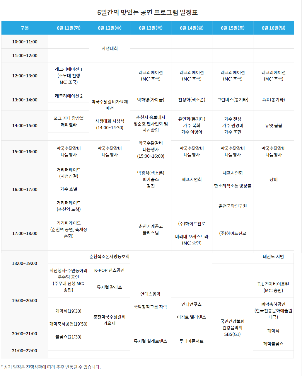 오는 6월 11일부터 16일까지 열리는 춘천닭갈비막국수축제에 여러분들의 많은 참여가 있길 기대하여 봅니다.