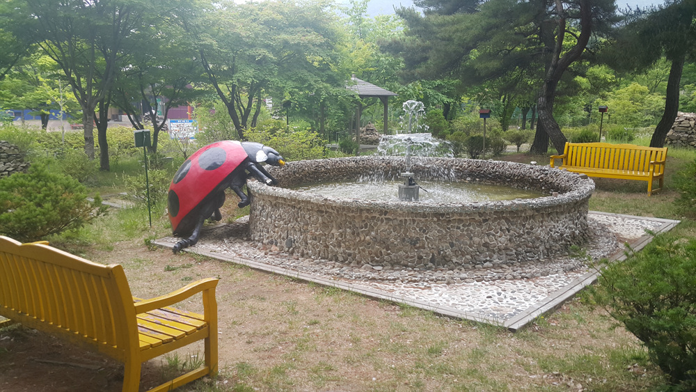테마공원의 분수대에는 물을 마시러 가는 무당벌레의 대형 조형물이 설치되어 있는데