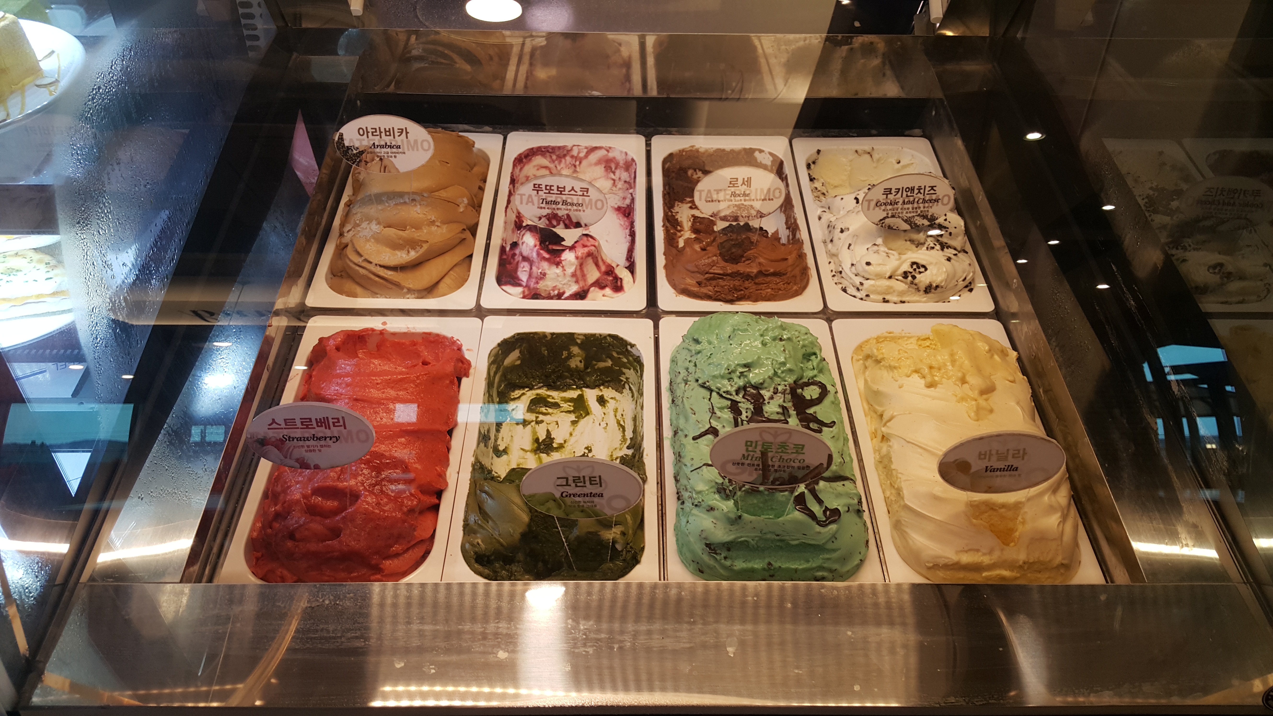 냉장고에는 아이스크림과 디저트 케이크가 들어있습니다.