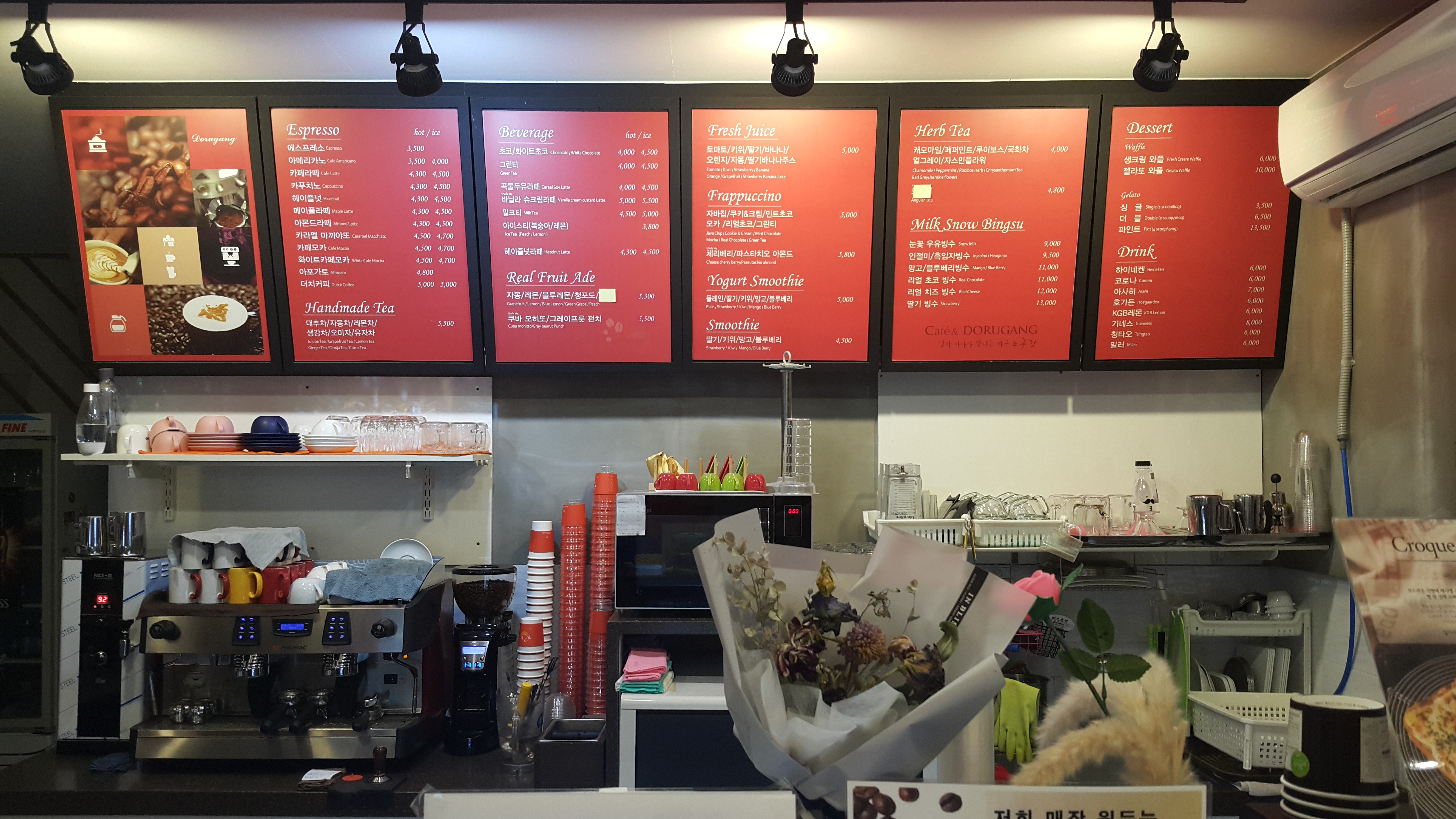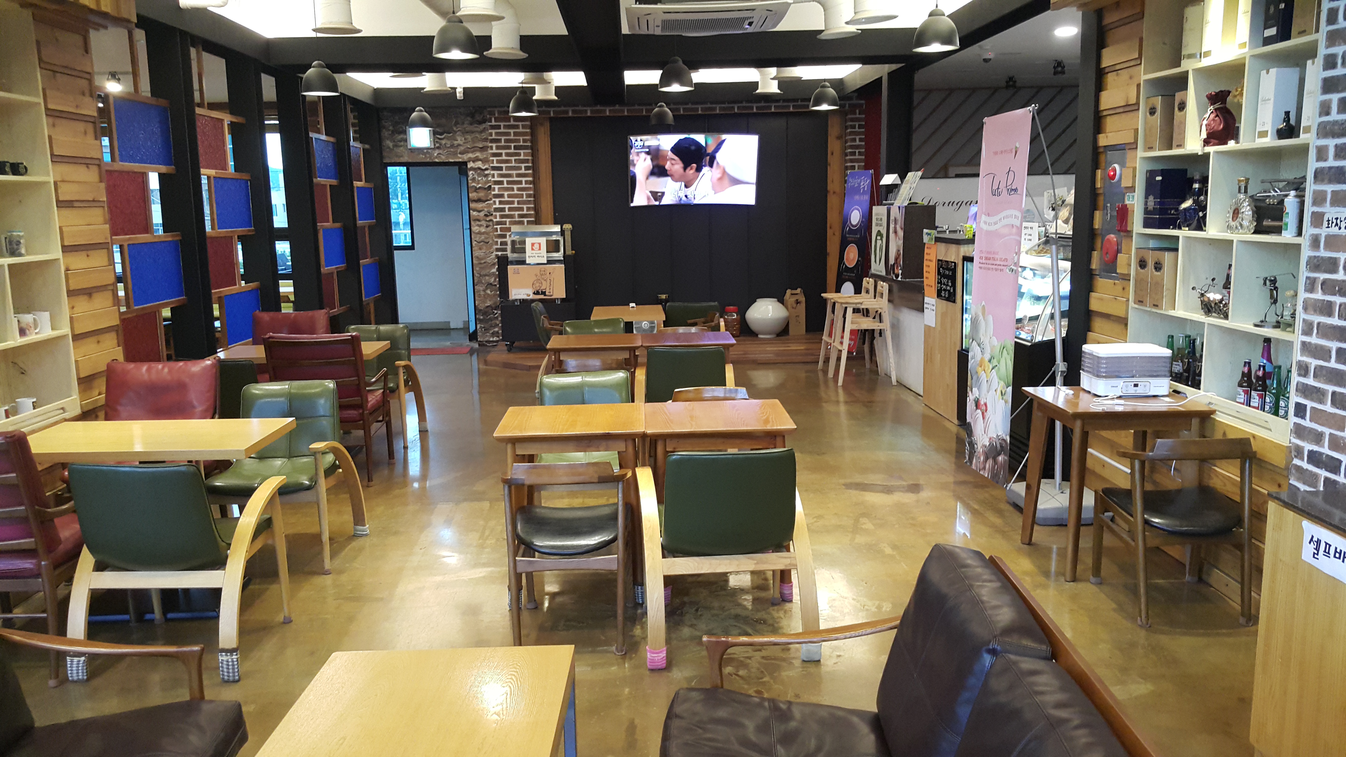실내 안쪽으로는 대형 모니터가 영상을 내보내고 있어 영상을 보며 커피 한잔 하기에도 좋습니다.