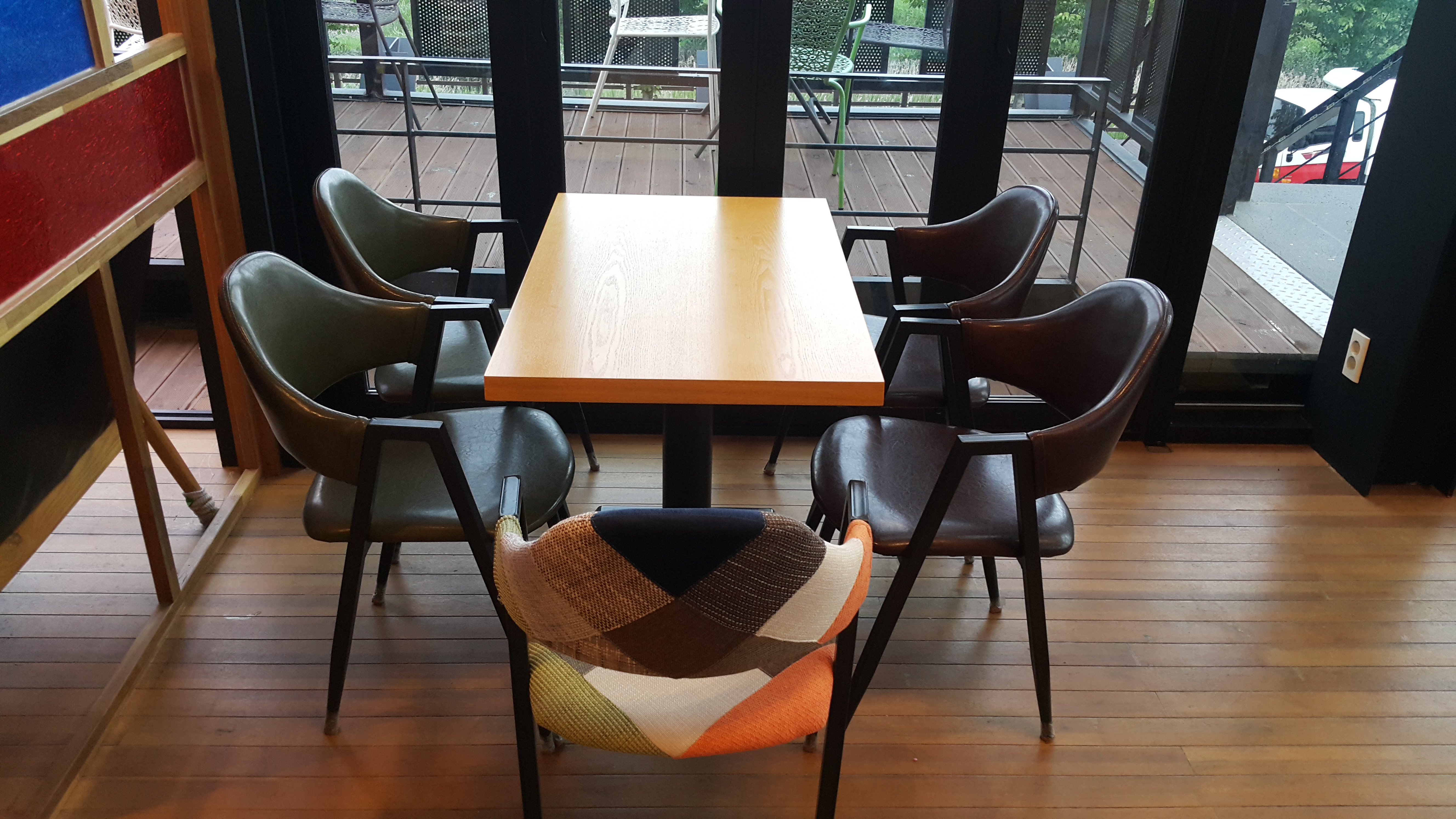 테이블과 의자들이 개성을 가지고 있는 디자인입니다.