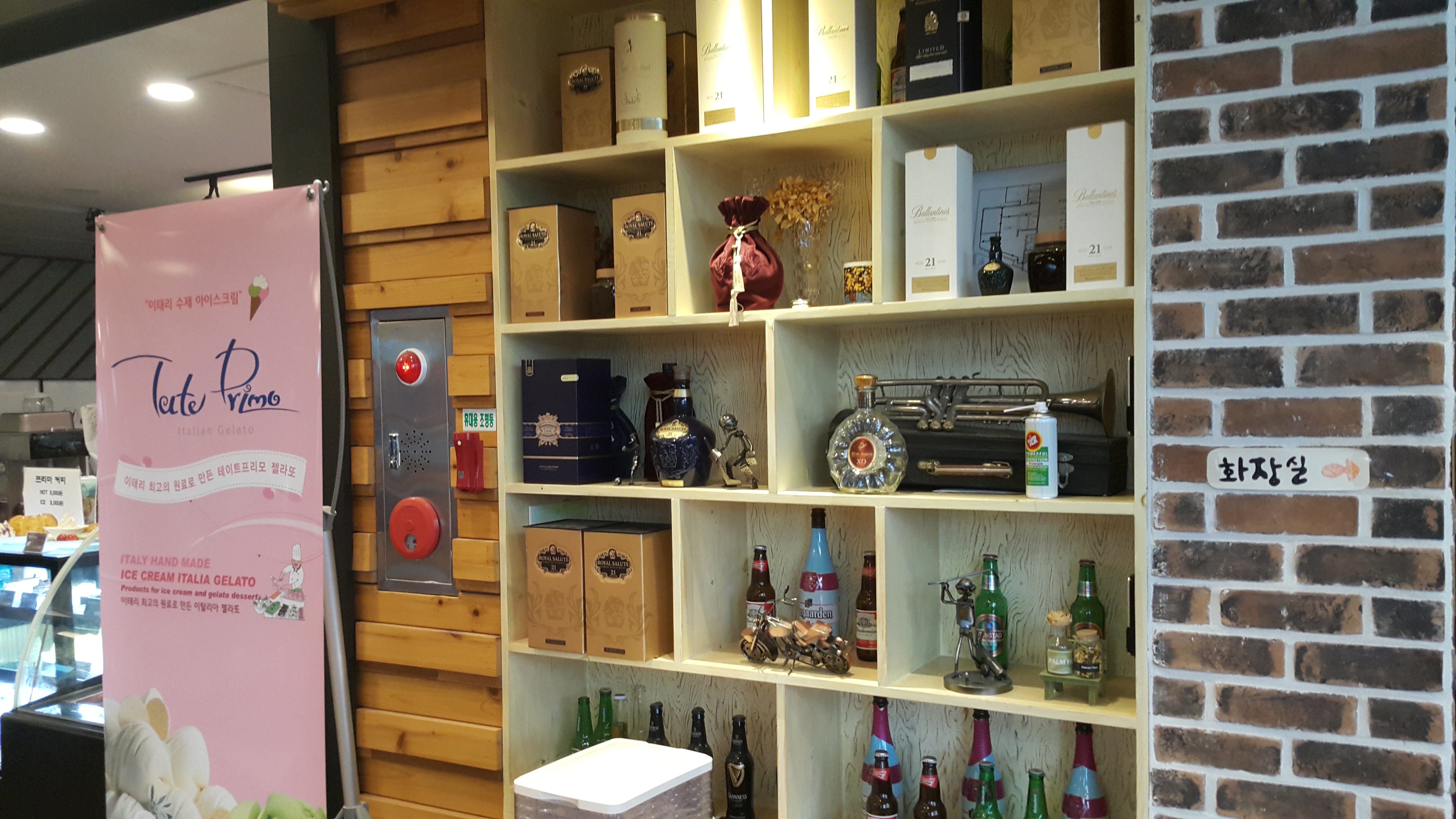 벽에 들어가 있는 장식장에는 여러 가지 예쁜 병들이 진열되어 있는 것을 볼 수 있습니다.