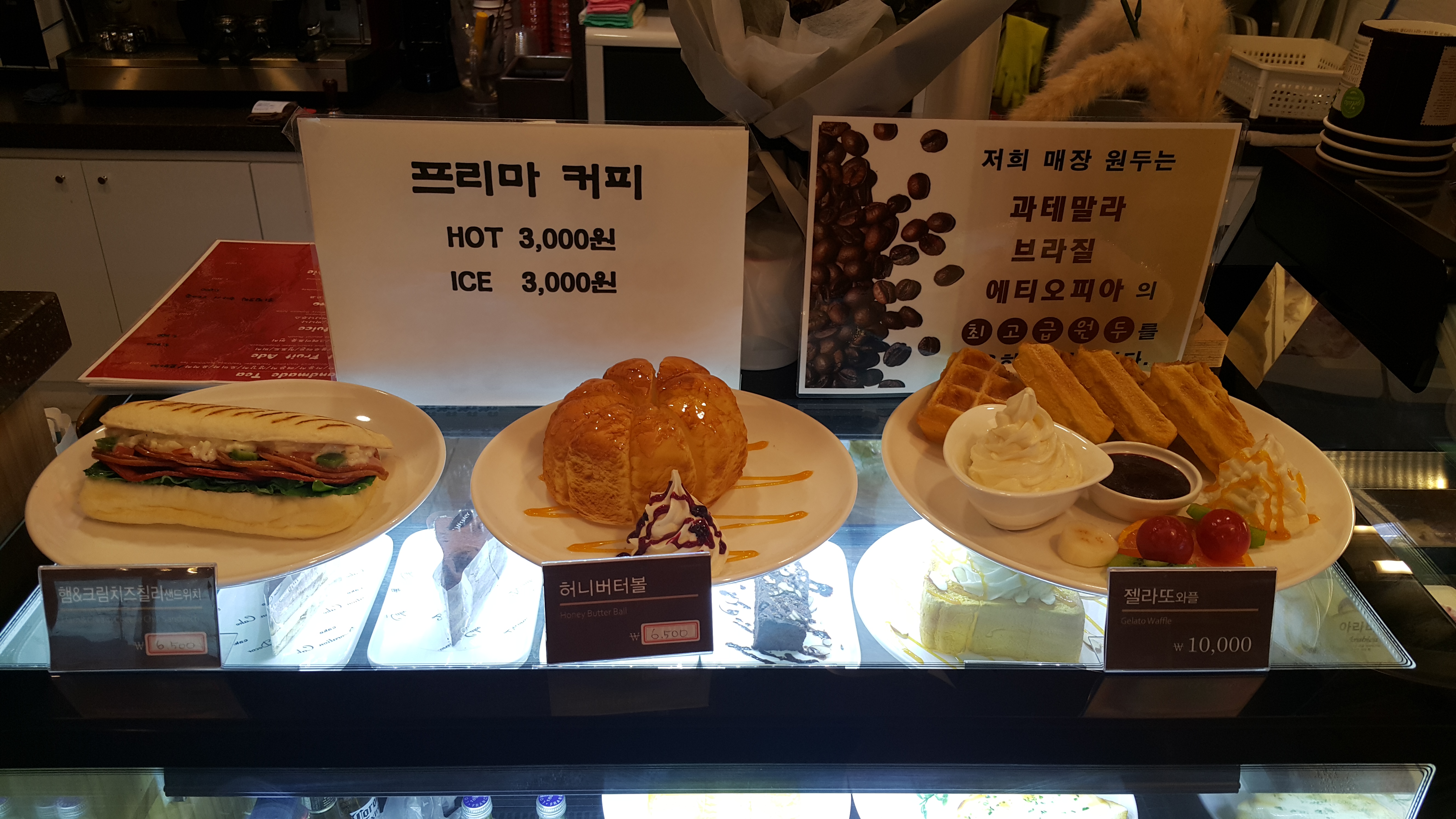 프리마 커피를 판매하고 있으며 원두는 과테말라 브라질 에티오피아의 최고급 원두를 사용하고 있습니다.
