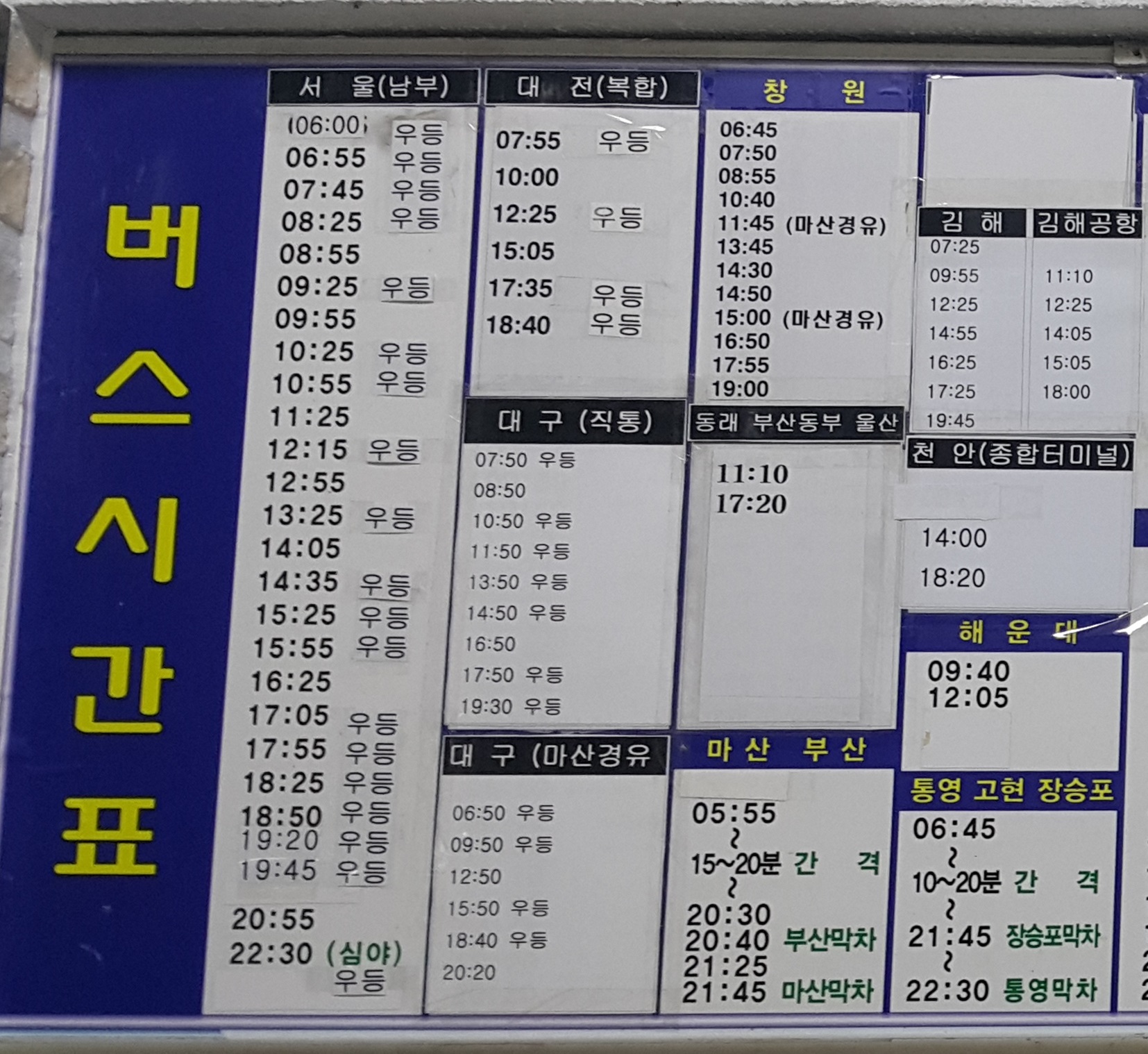 고성 출발 서울(남부), 대전(복합), 대구(직통), 대구(마산 경유), 창원, 동래, 부산동부, 울산, 천안(종합터미널), 김해공항, 해운대, 통영, 고현, 장승포 방면.