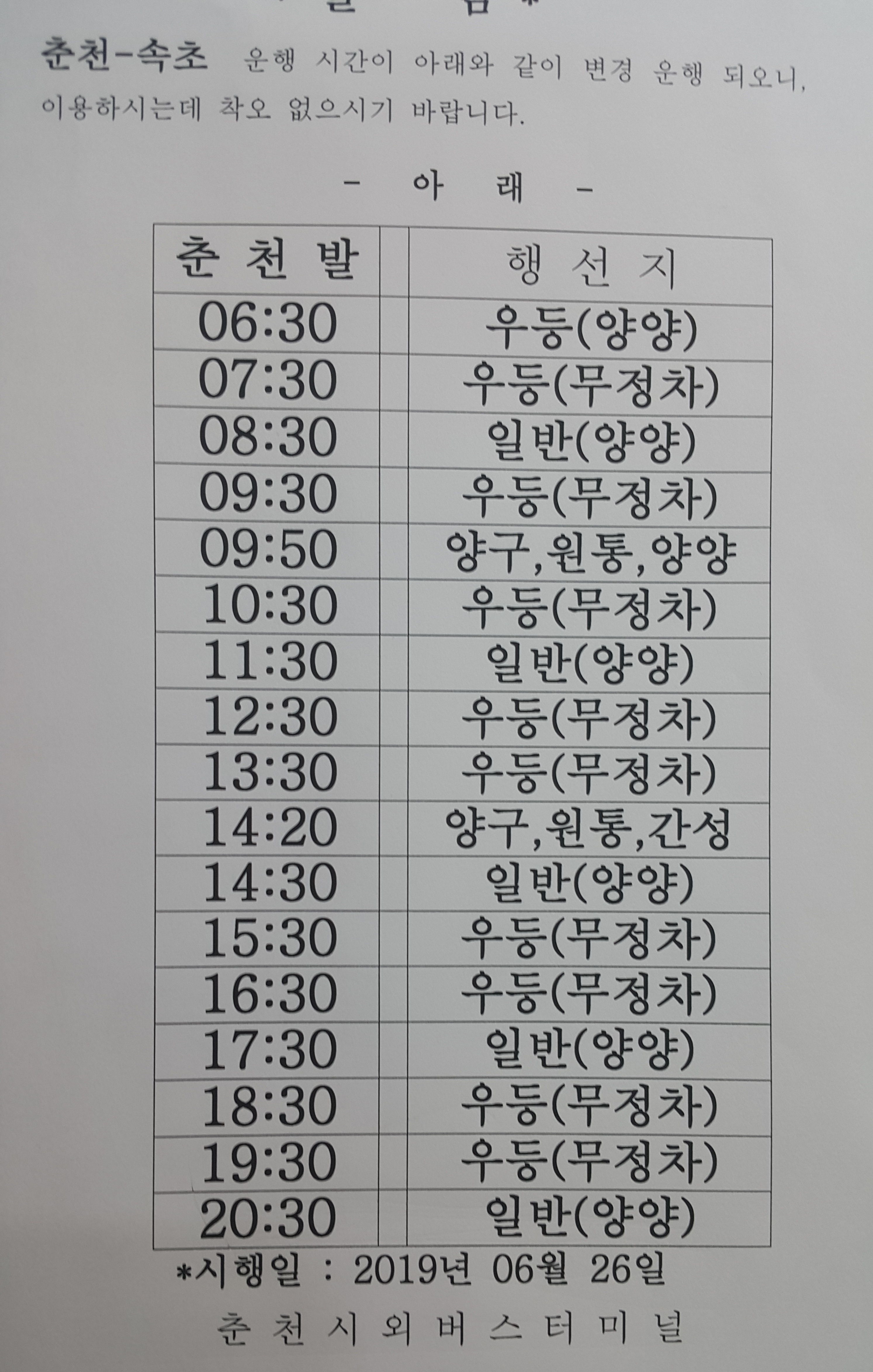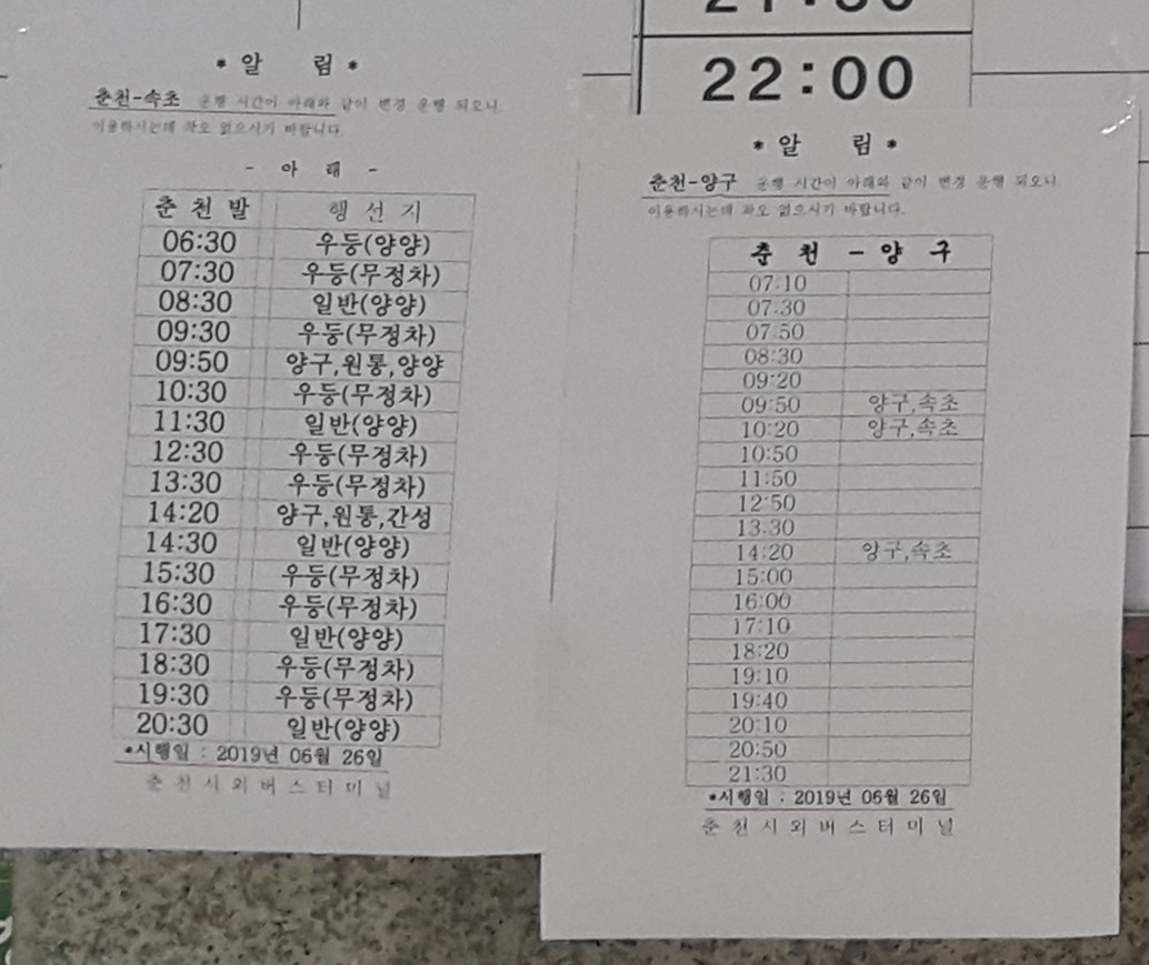 춘천 출발 속초, 양구, 강릉 방면.
