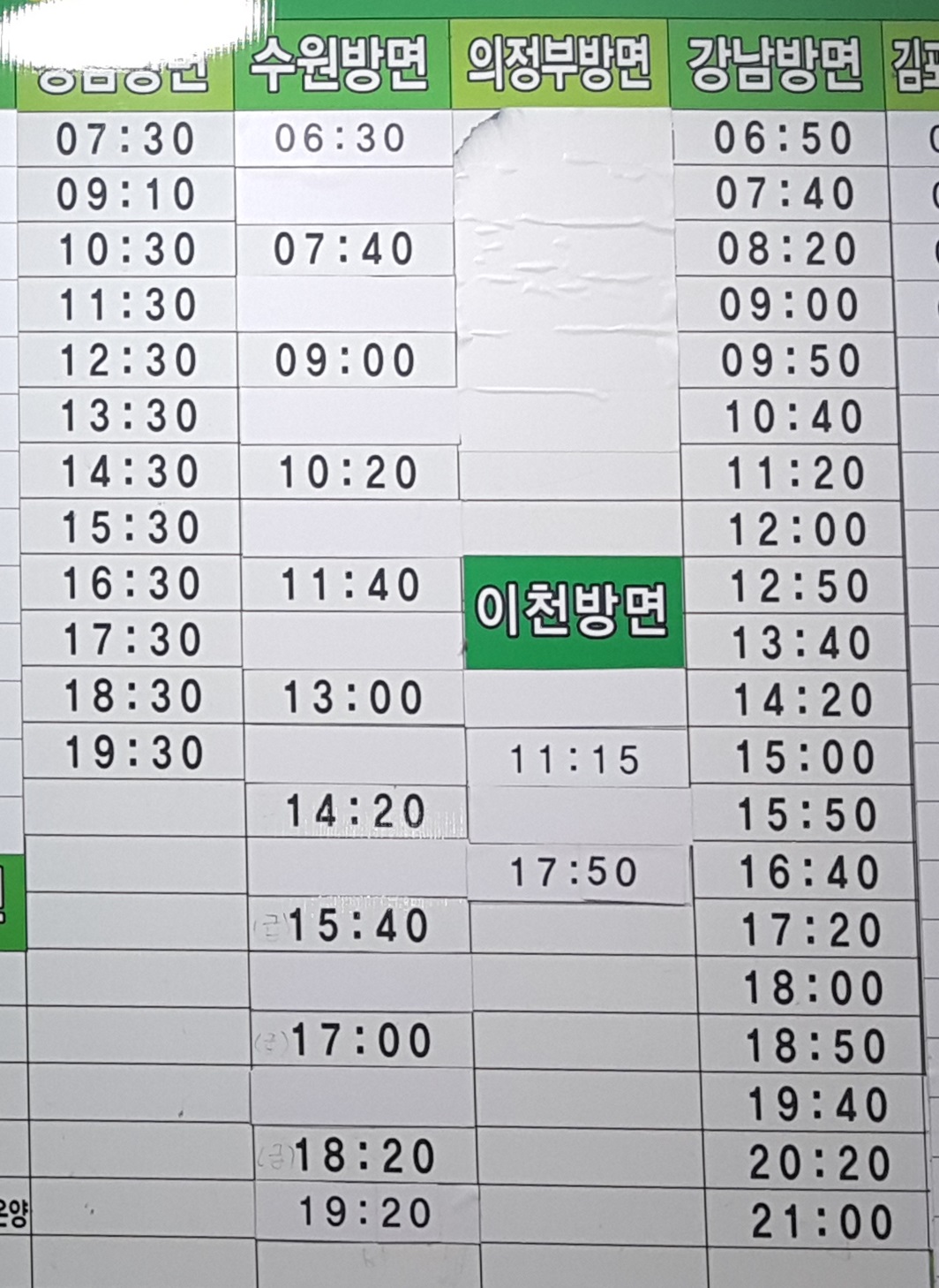 춘천 출발 성남, 수원, 의정부, 이천, 강남 방면.