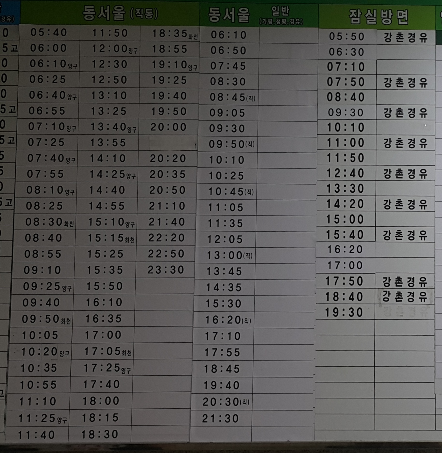 춘천 출발 동서울(직통), 동서울(일반, 가평, 청평, 경유), 잠실 방면.