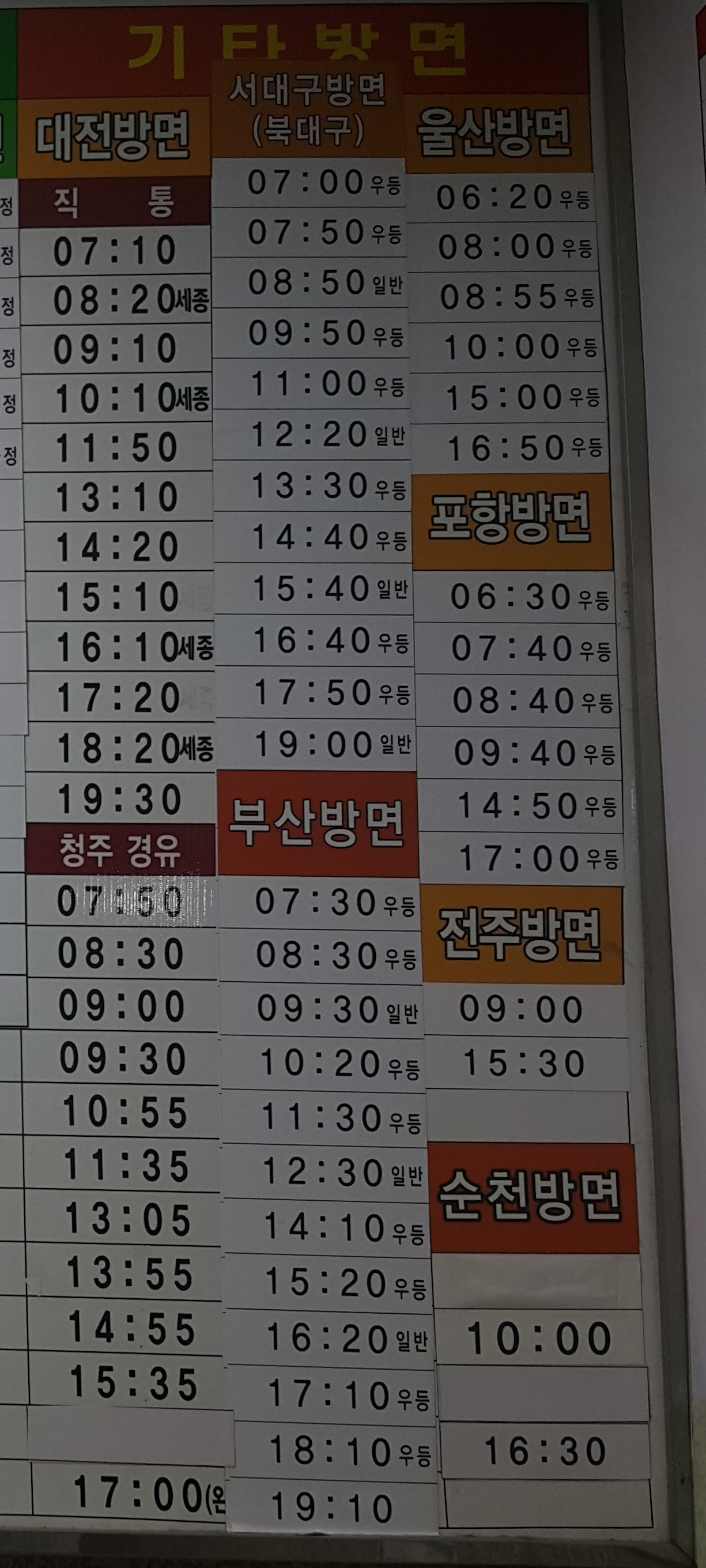 춘천 출발 대전, 청주, 서대구(북대구), 부산, 울산, 포항, 전주, 순천 방면.