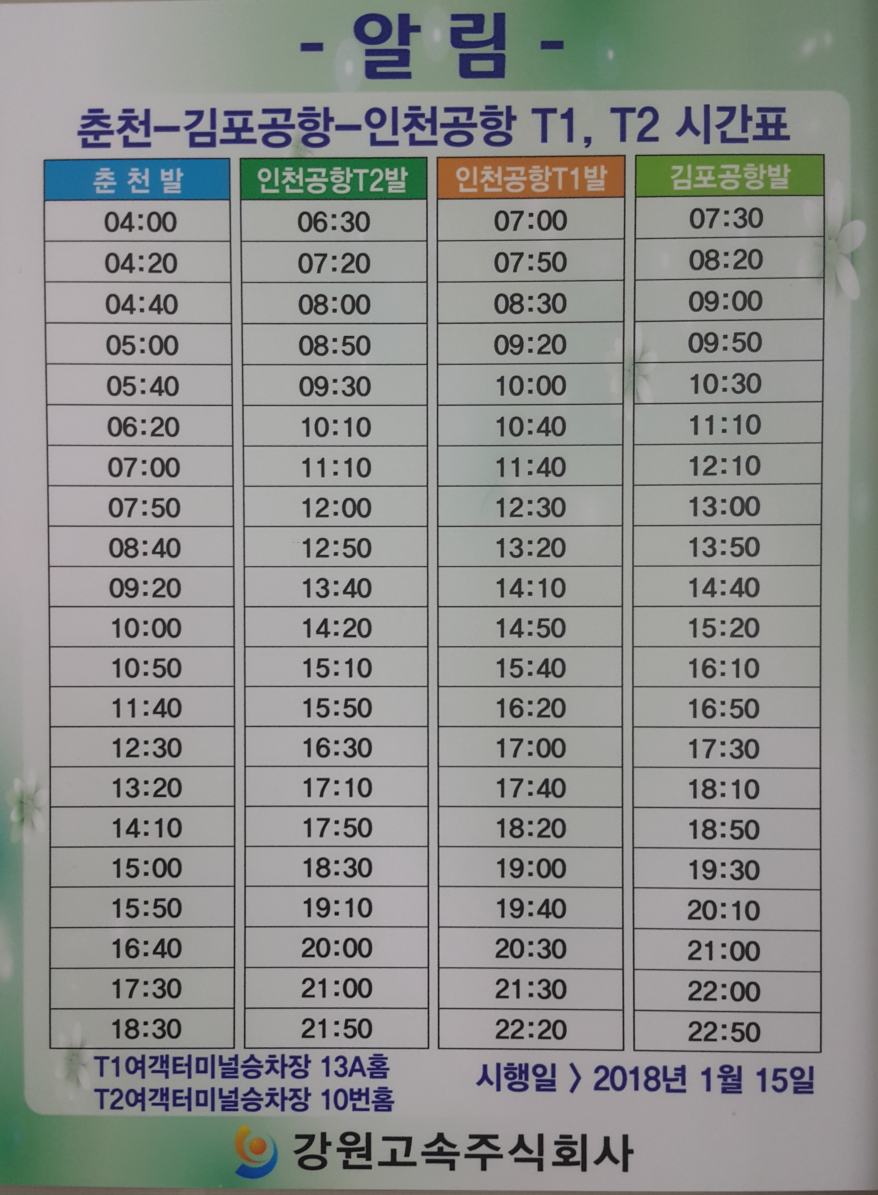 춘천, 김포공항, 인천공항 시간표.