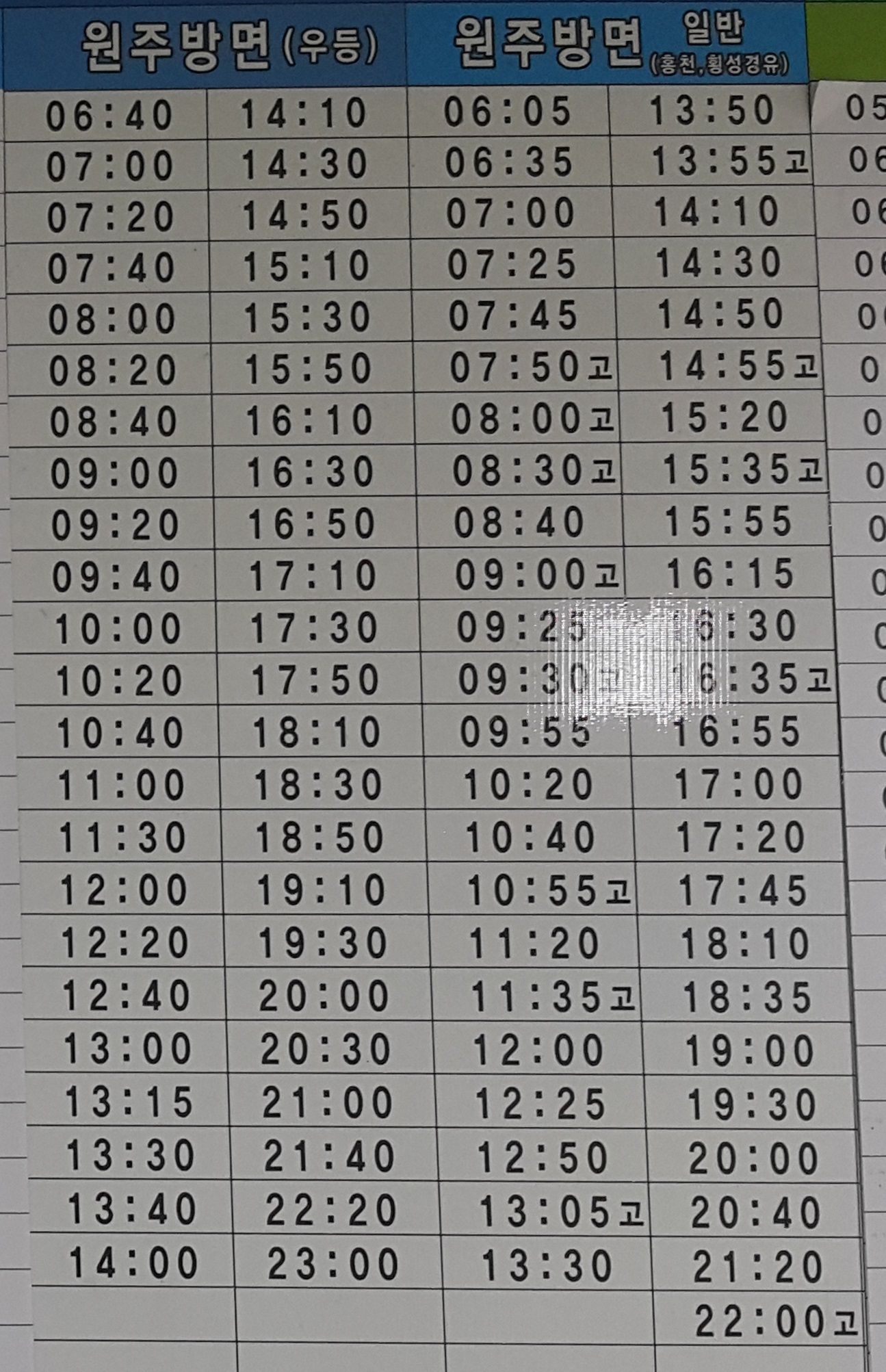 춘천 출발 원주(우등), 원주(일반, 홍천, 횡성 경유) 방면.