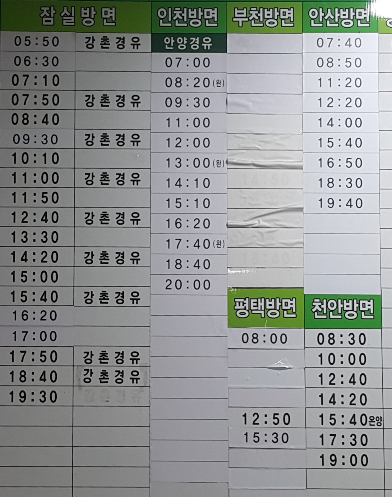춘천 출발 잠실, 인천, 부천, 안산, 평택, 천안 방면.