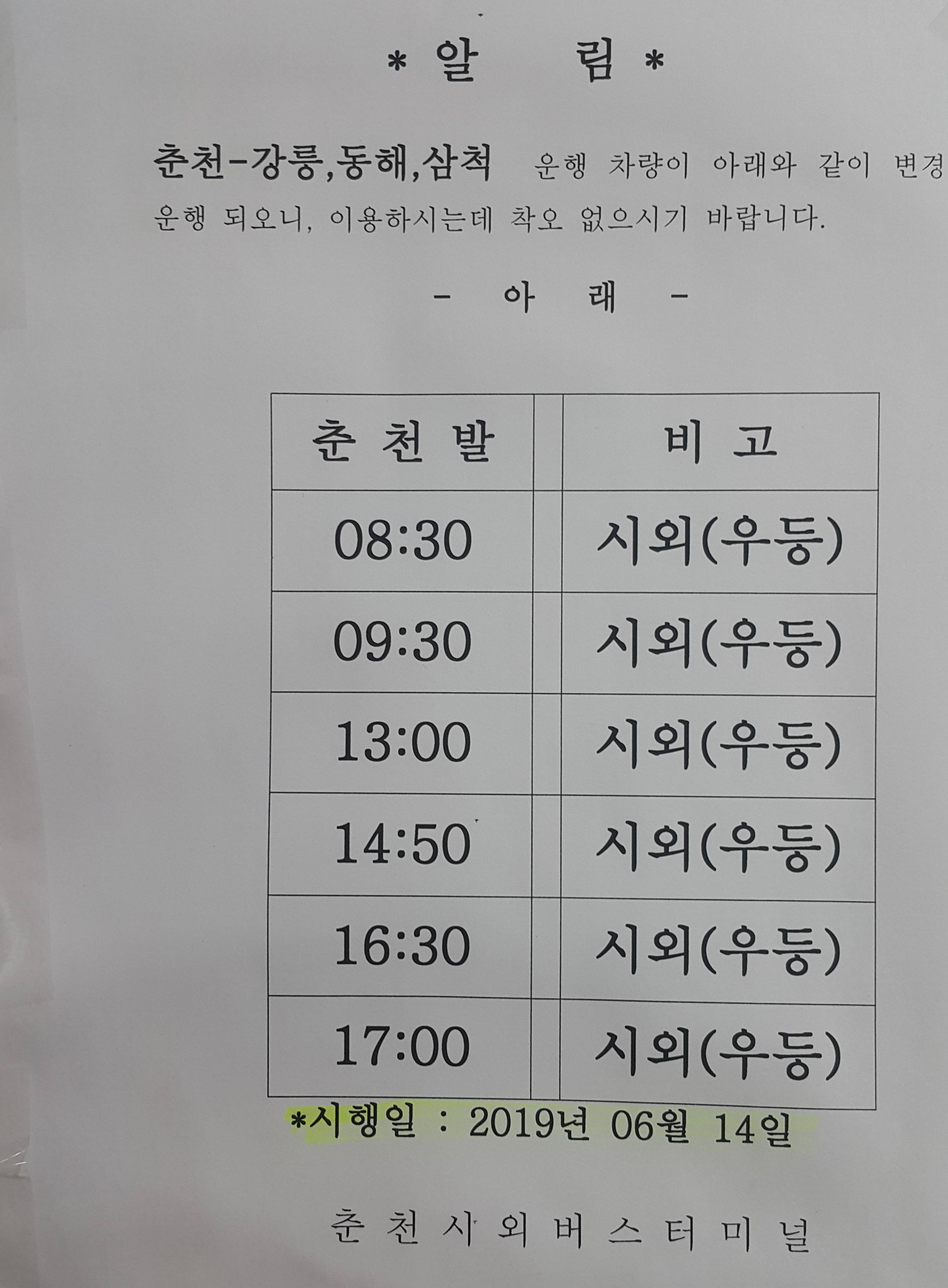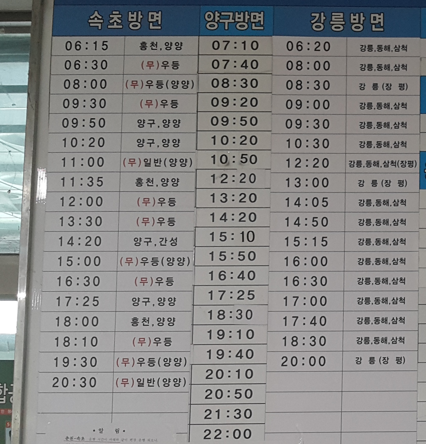 춘천 출발 강릉, 동해, 삼척 방면.
