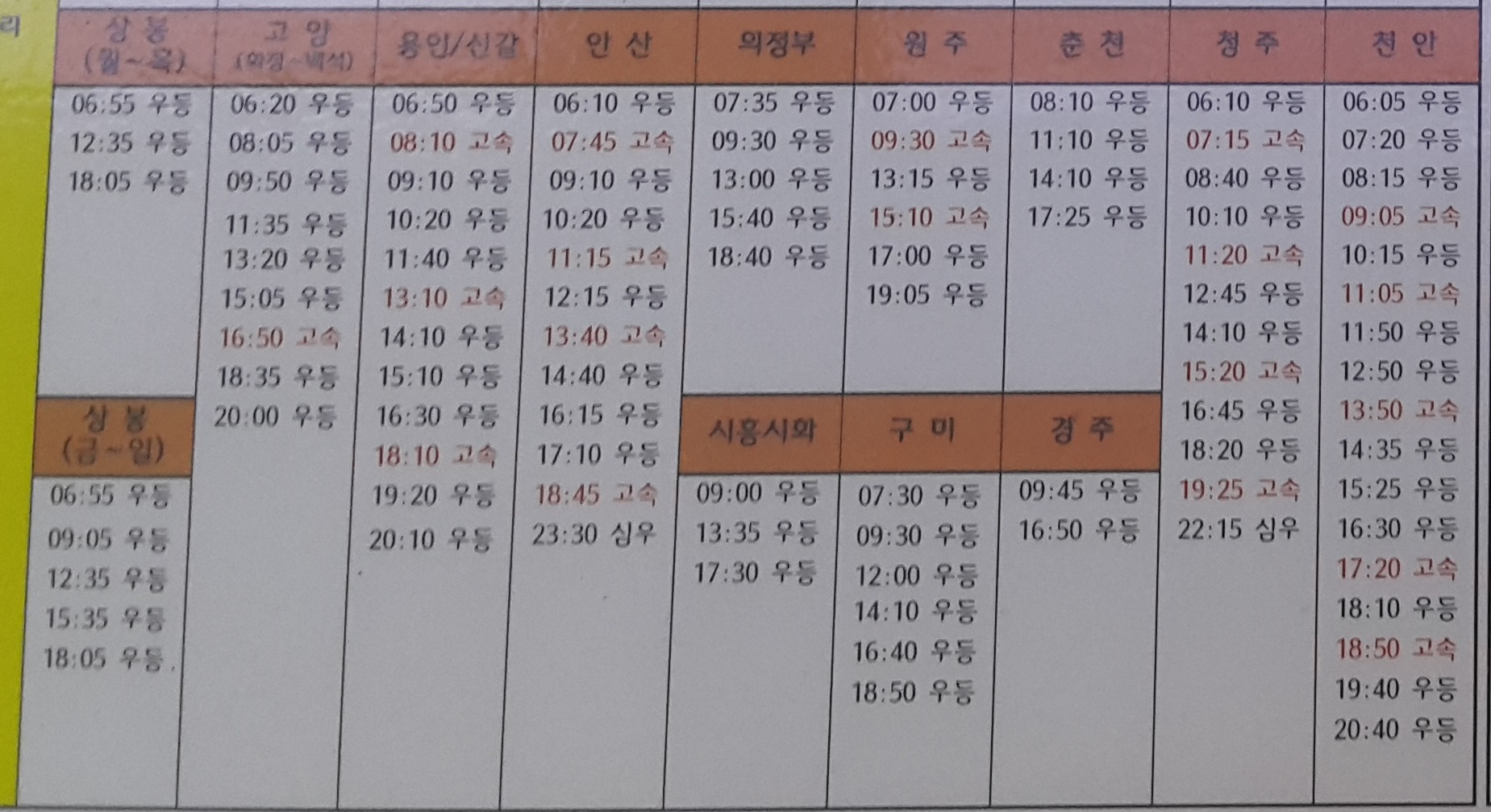 광주 출발 상봉, 고양, 용인, 신갈, 안산, 의정부, 원주, 춘천, 청주, 천안, 시흥 시화, 구미, 경주 방면.