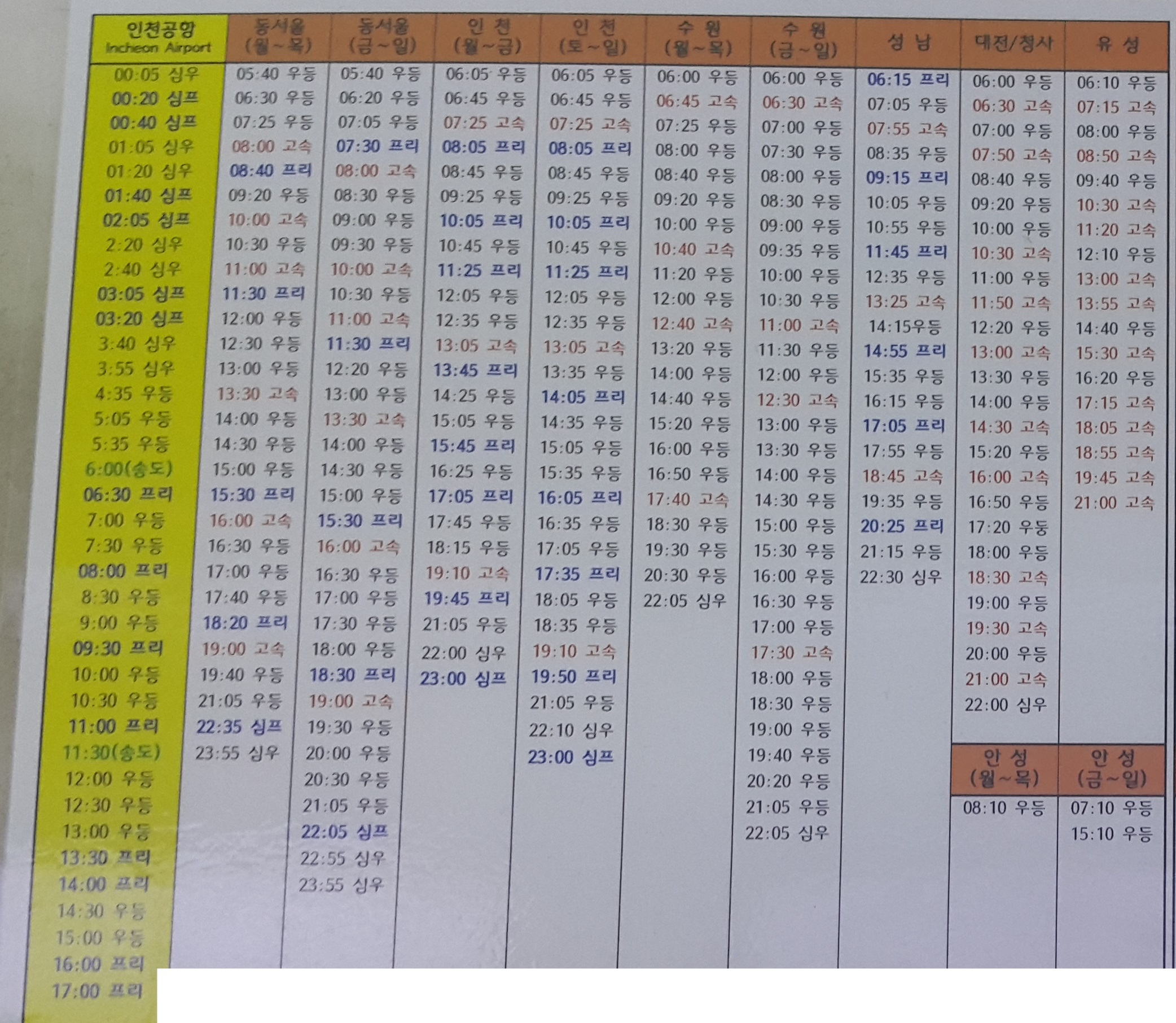 광주 출발 인천공항, 동서울, 성남, 대전, 유성, 안성 방면.