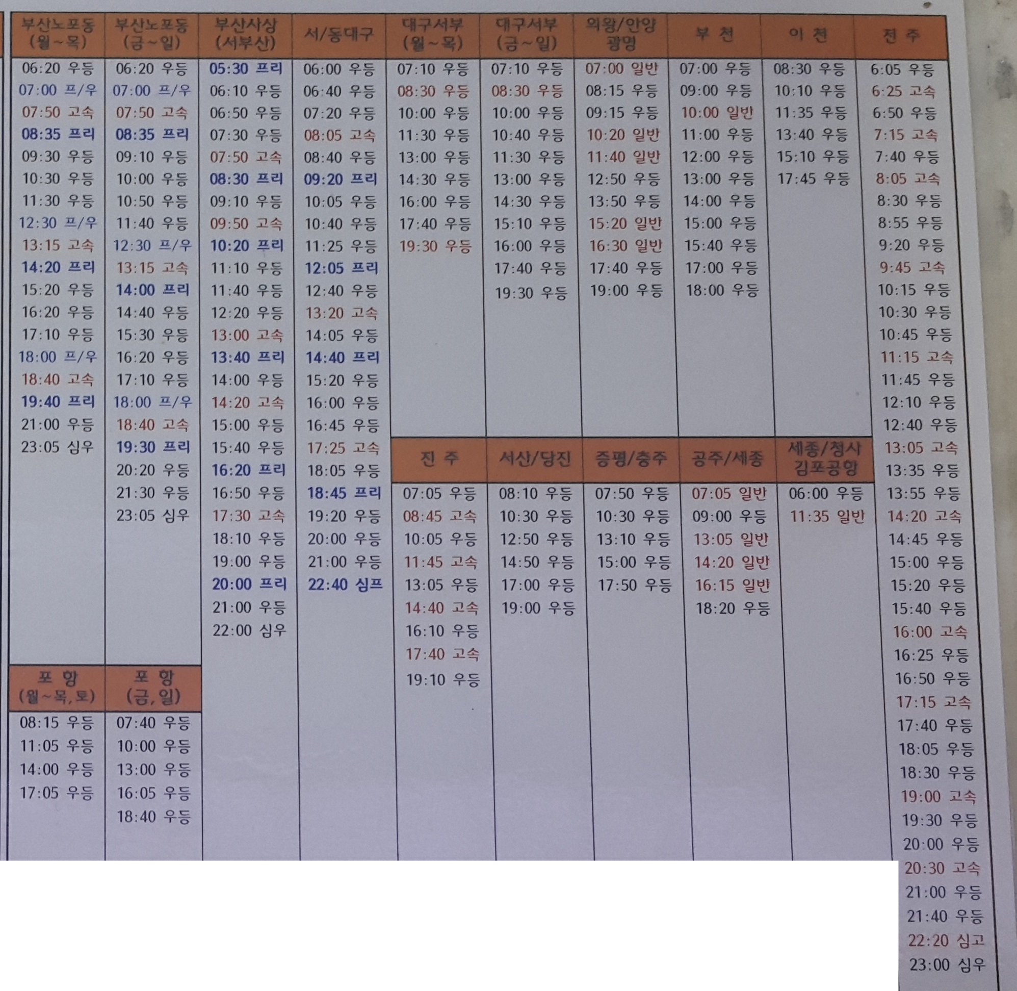 광주 출발 부산(노포동), 부산(사상), 서대구, 동대구, 의왕, 안양, 광명, 부천, 이천, 전주, 포항, 진주, 서산, 당진, 서산, 당진, 증평, 충주, 공주, 세종, 김포공항 방면.