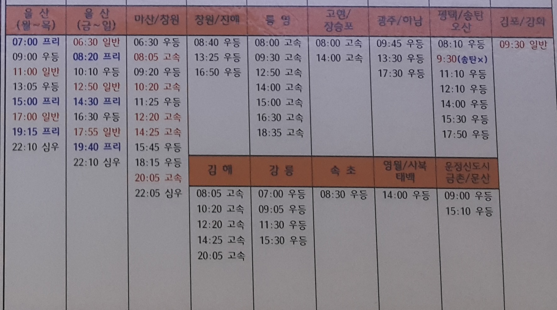 광주 출발 울산, 마산, 창원, 진해, 통영, 고형, 장승포, 하남,평택, 송탄, 오산, 김포, 강화, 김해, 강릉, 속초, 영월, 사북, 태백, 운정신도시, 금촌, 문산,