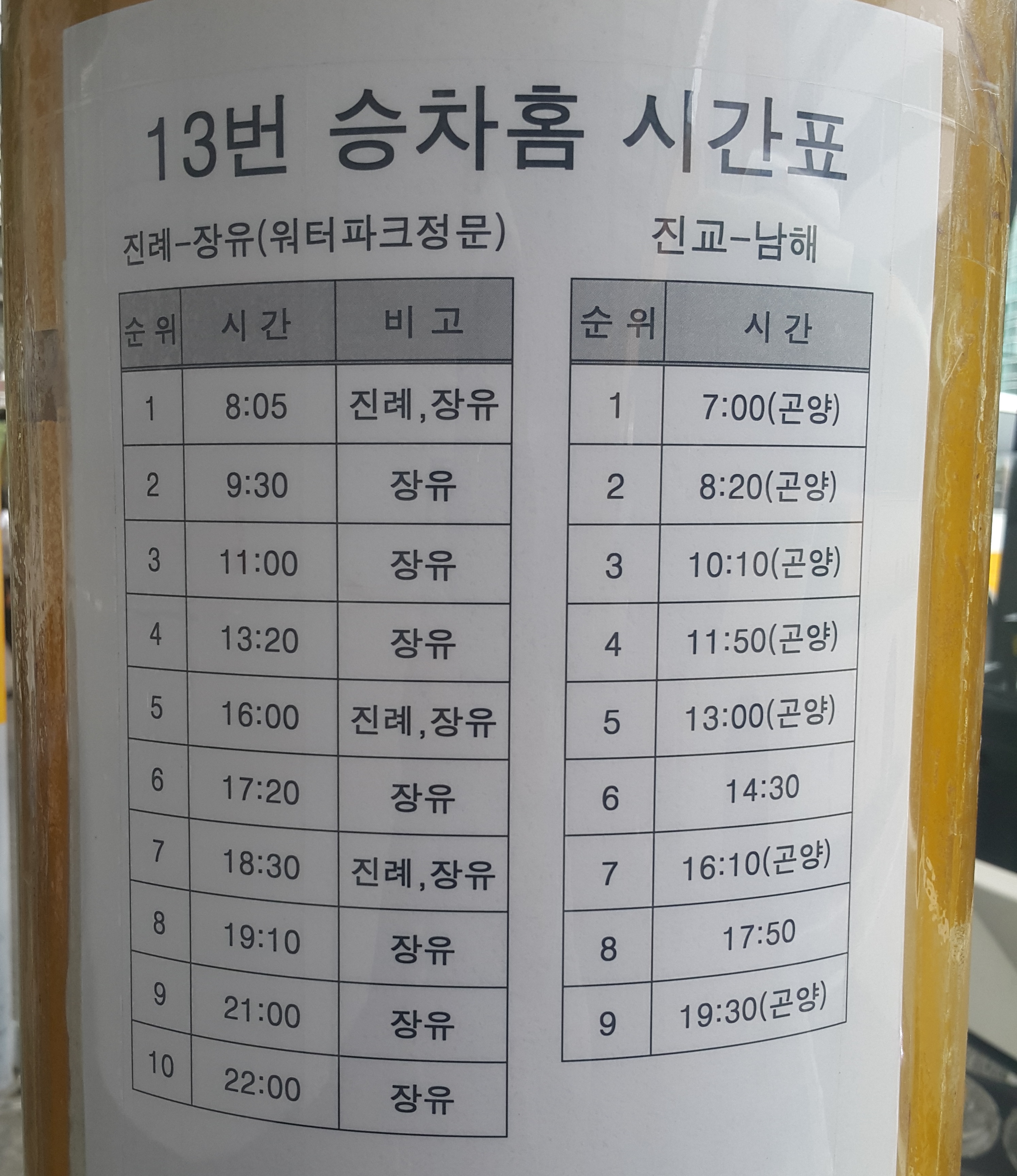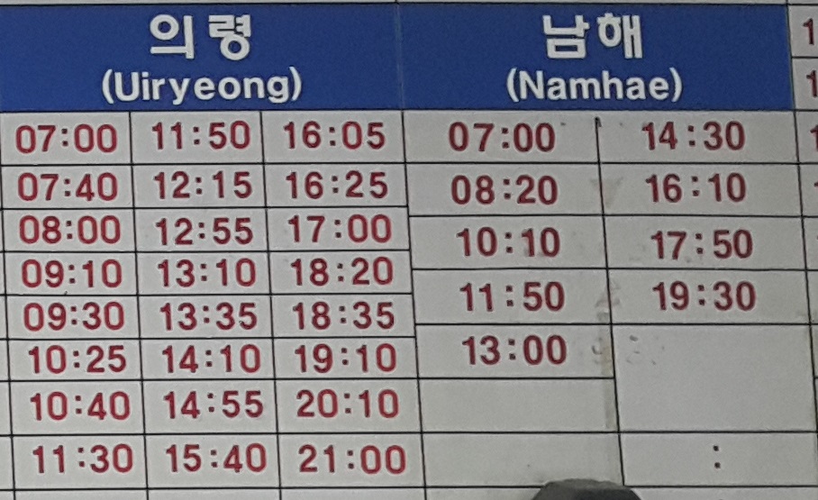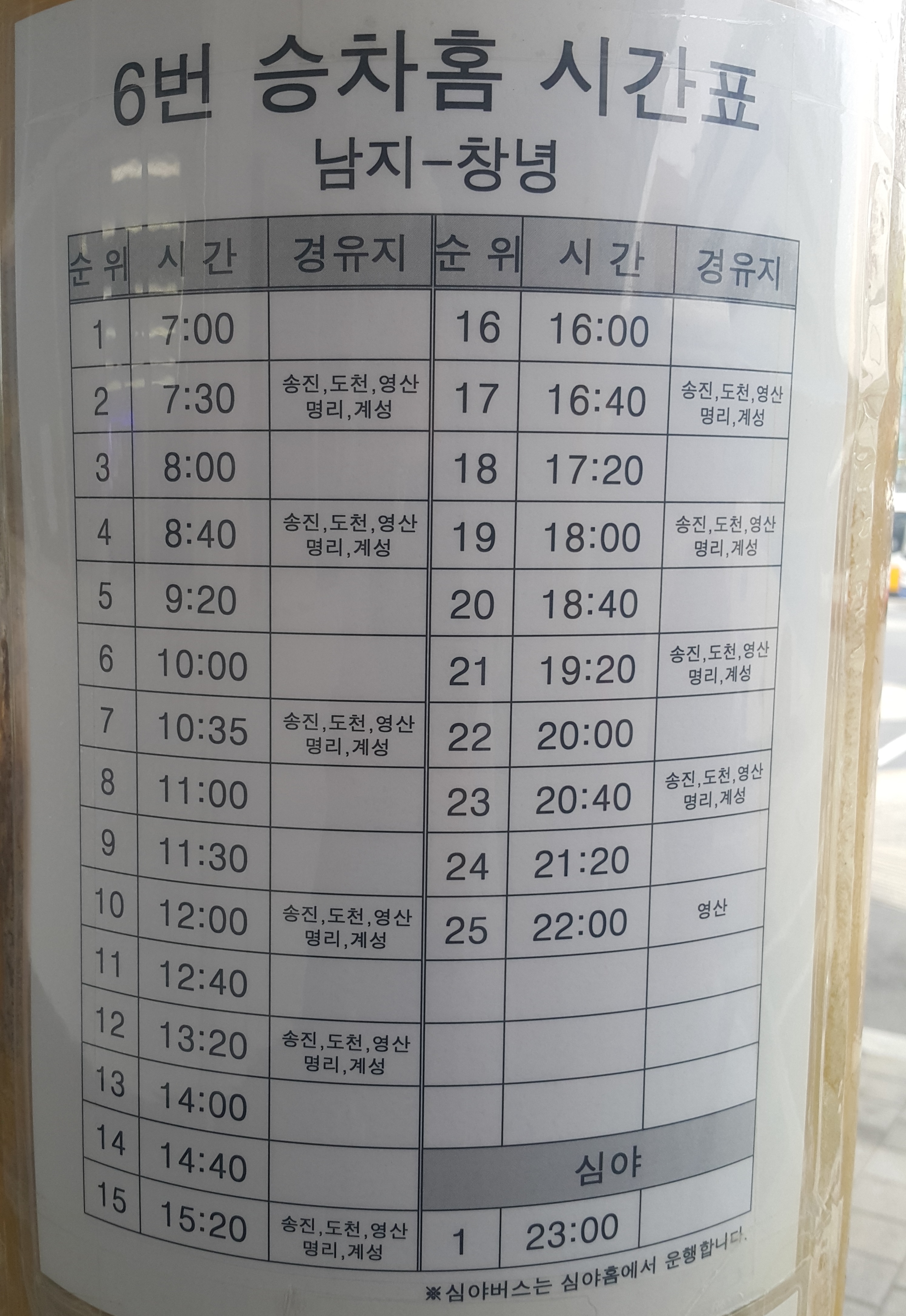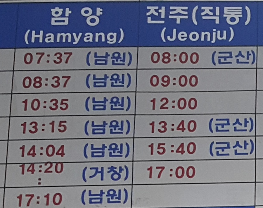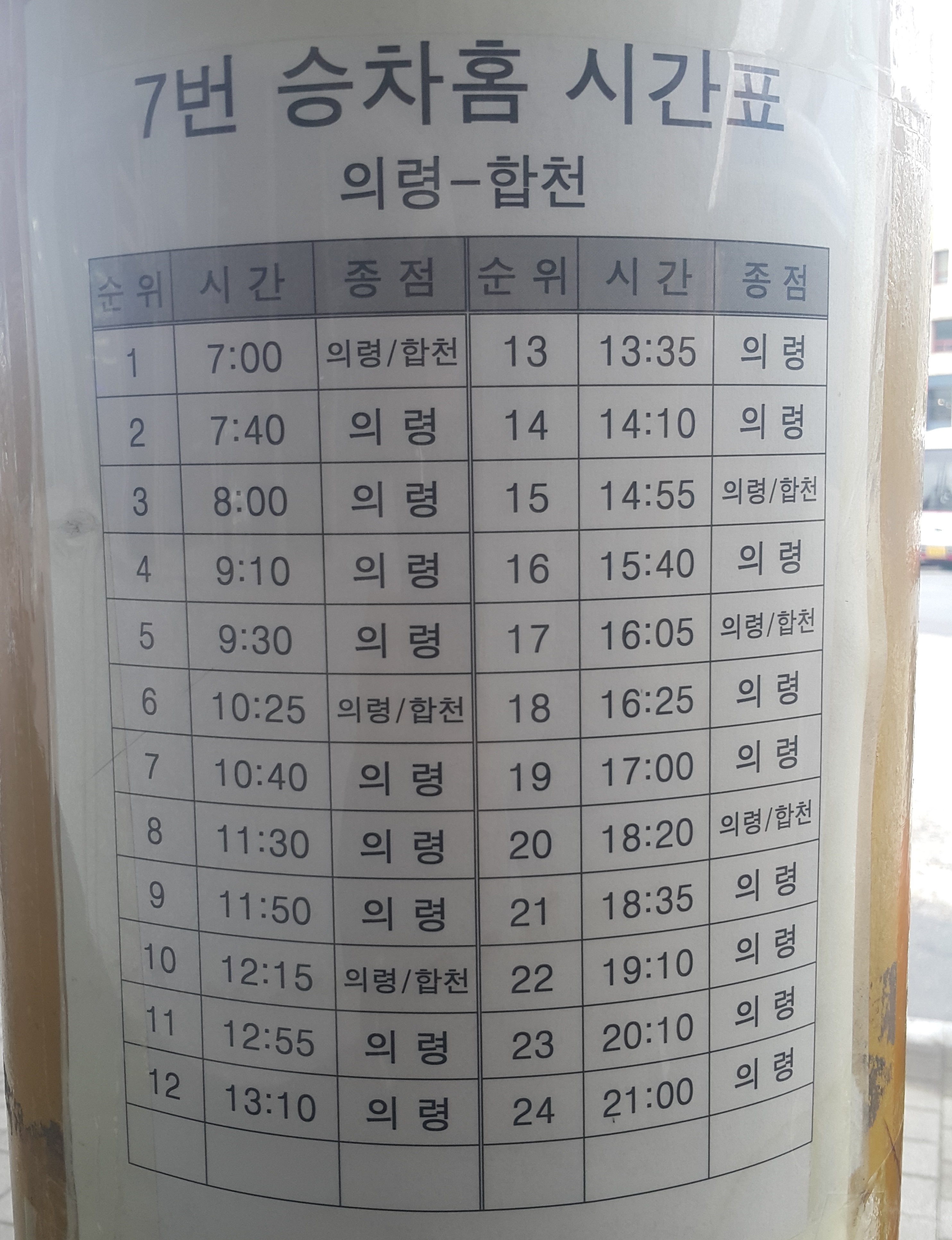 마산시외버스터미널 출발 원주, 군북, 합천 방면.