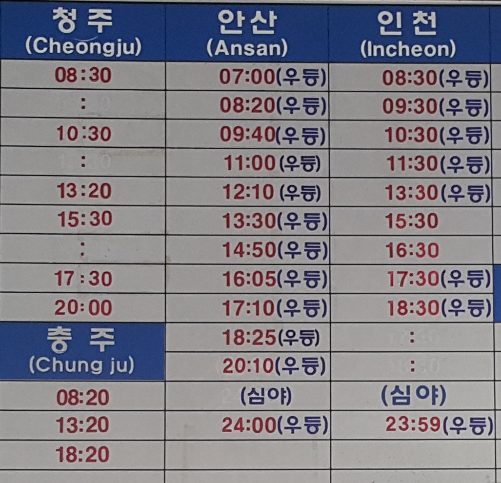 마산시외버스터미널 출발 청주, 안산, 인천, 충주 방면.