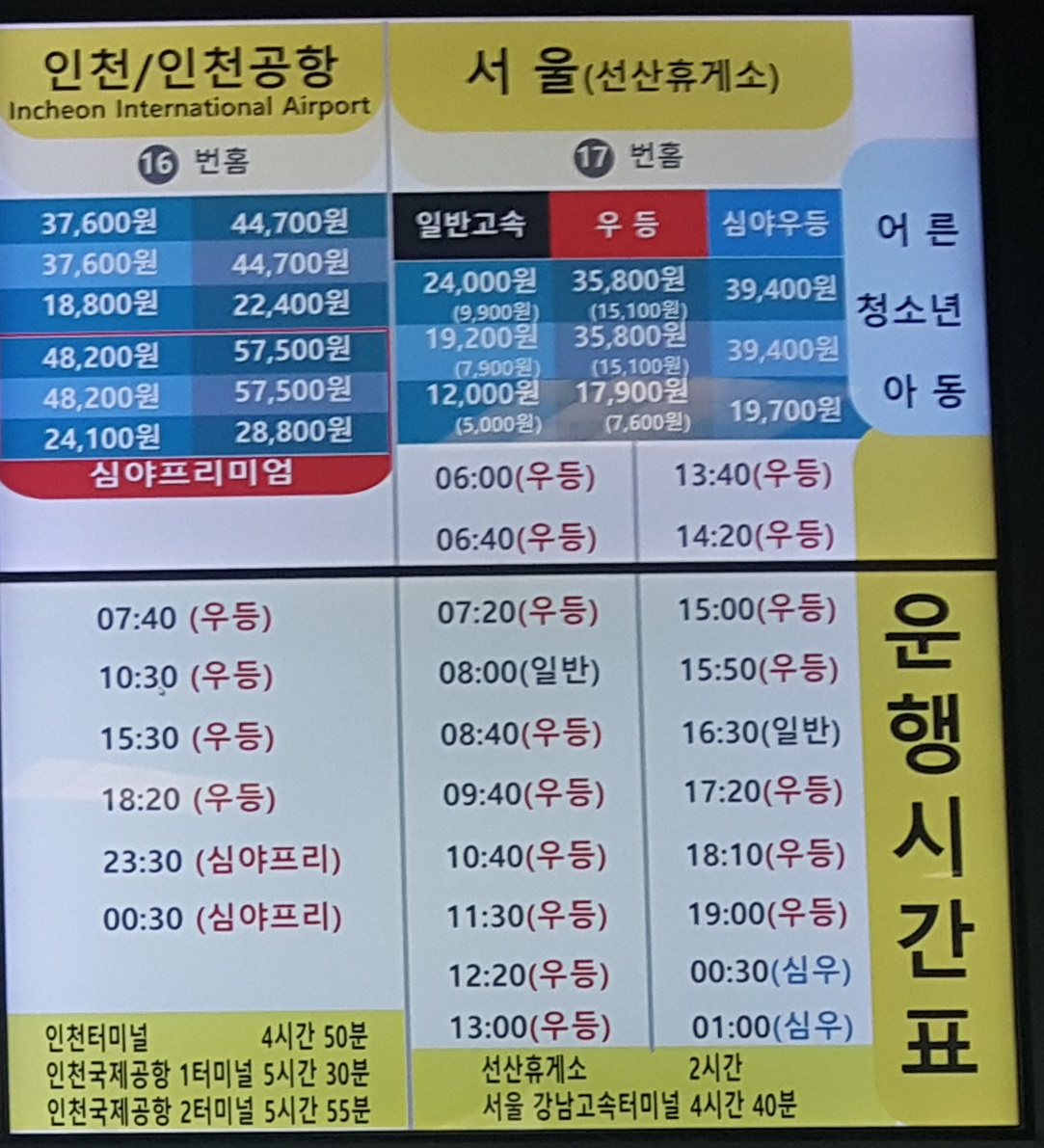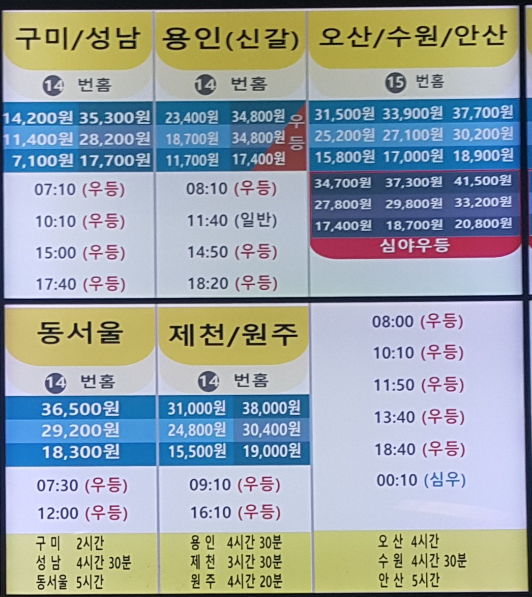 구미, 성남, 용인(신갈), 오산, 수원, 안산, 동서울, 제천, 원주 방면.