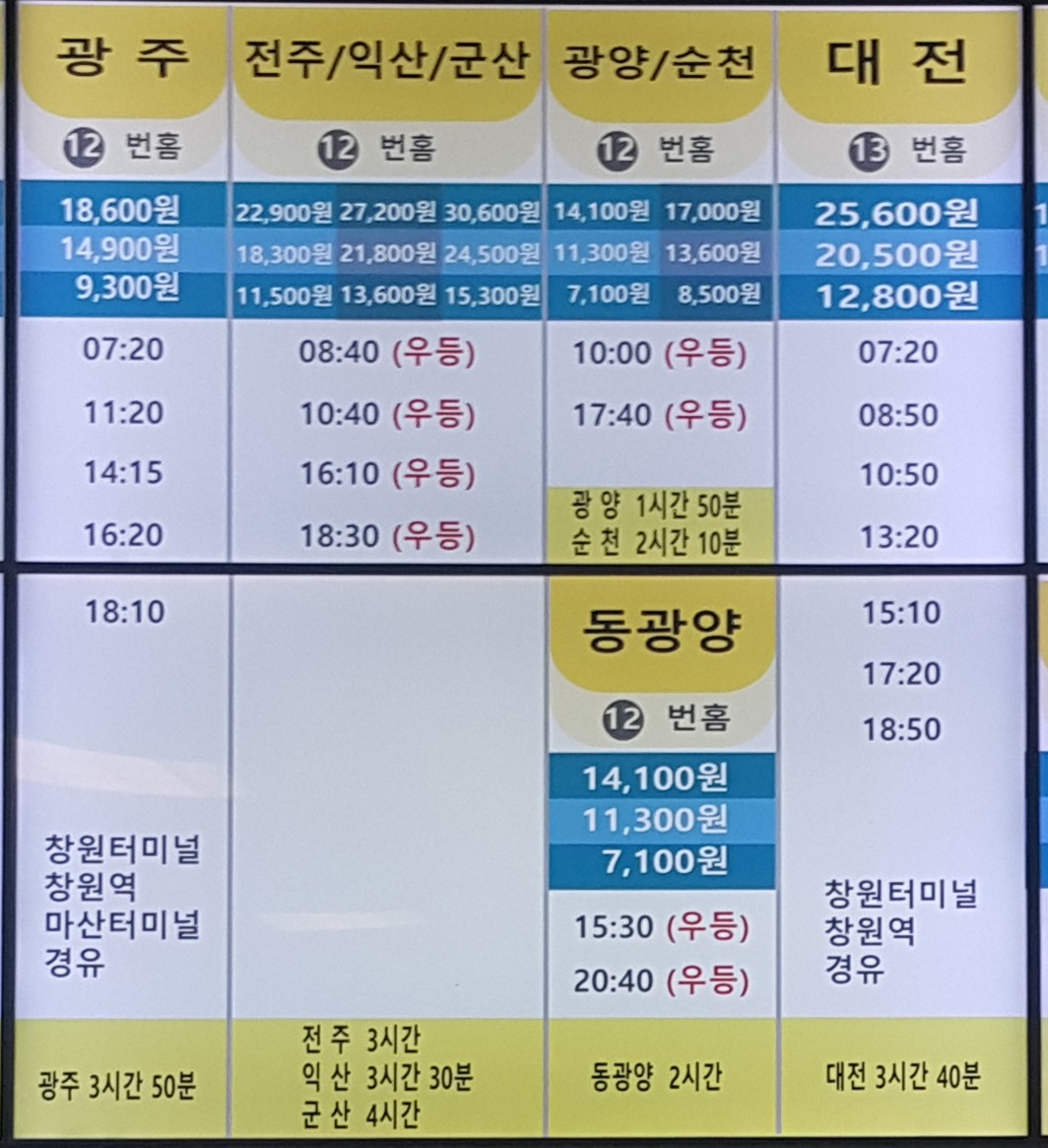 광주, 전주, 익산, 군산, 동광양, 광양, 순천, 대전 방면.