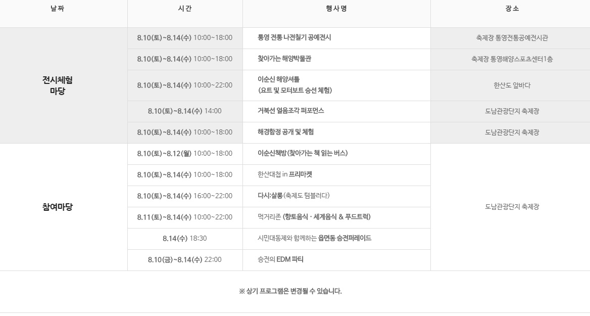 장 소 : 도남 관광단지, 한산 앞바다 등 통영시 일원