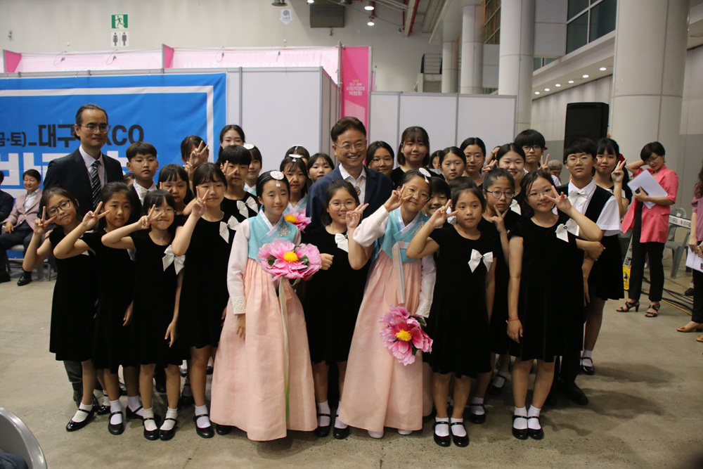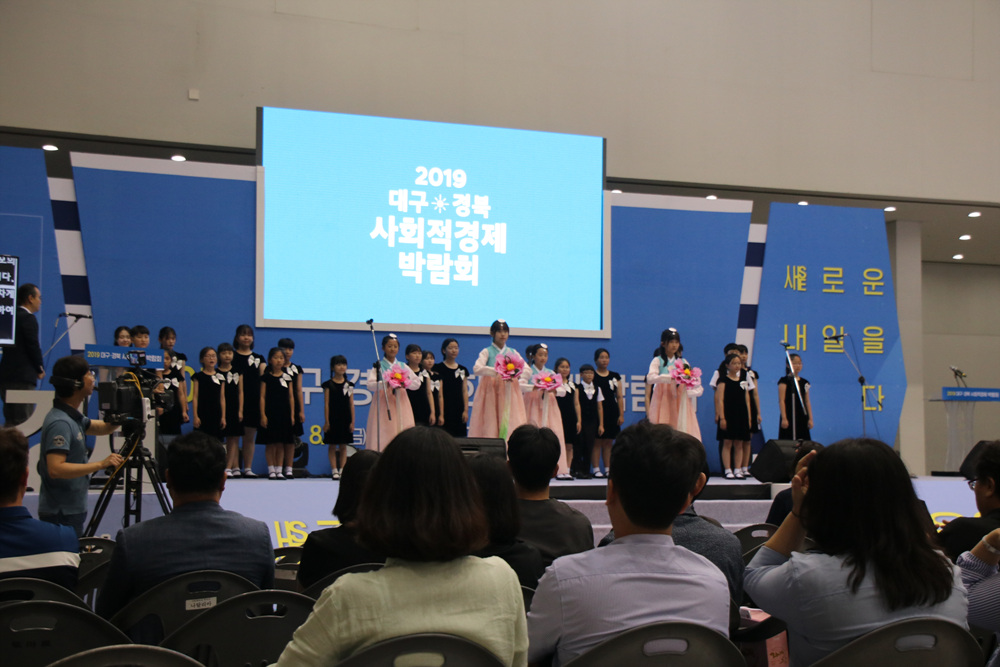‘2019 대구·경북 사회적경제박람회' 메인무대에서 개막식전 공연을 펼치고 있는 안동시 소년소녀 합창단의 모습입니다.