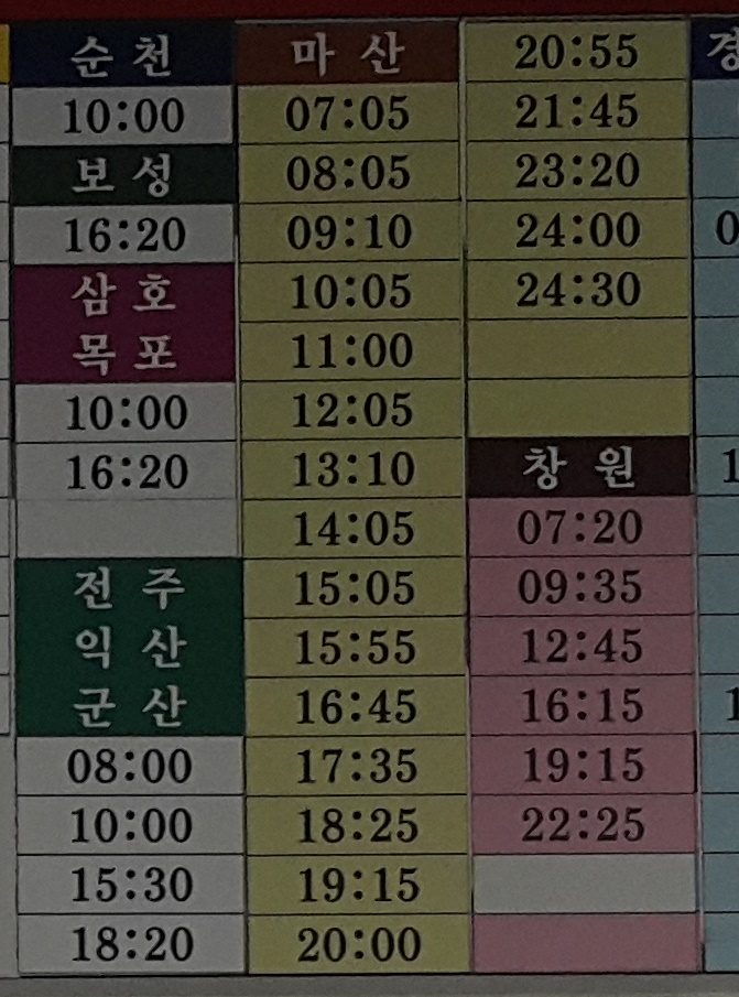 양산시외버스터미널 출발 순천, 보성, 삼호, 목포, 전주, 익산, 군산, 마산, 창원 방면.