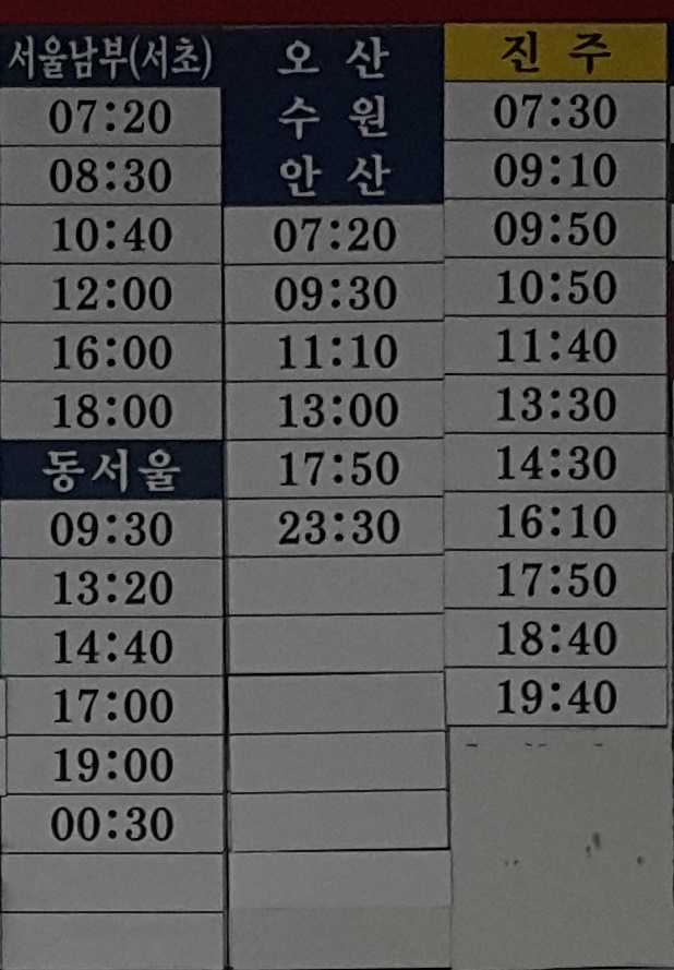 양산시외버스터미널 출발 서울 남부, 동서울, 오산, 수원, 안산 진주 방면.