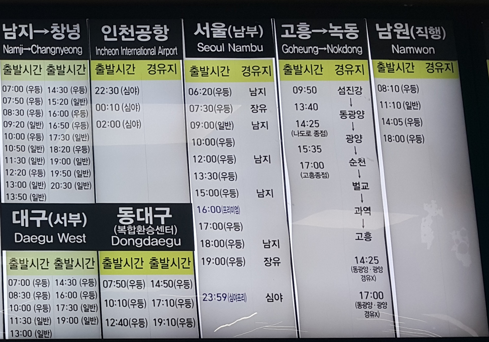 사상 출발 남지, 창녕, 인천공항, 대구(서부), 동대구, 서울(남부), 고흥, 녹동, 남원 방면.