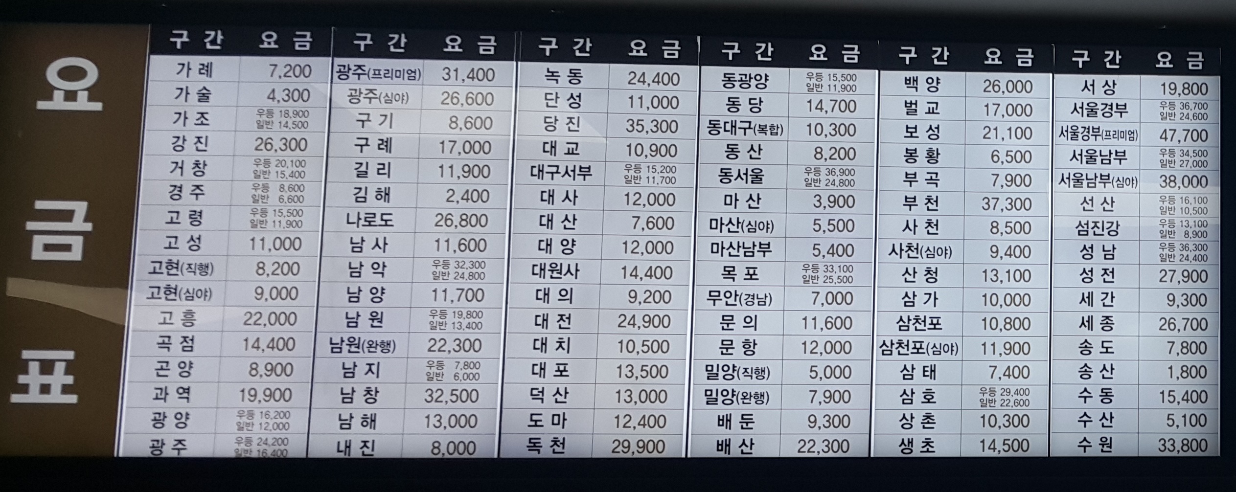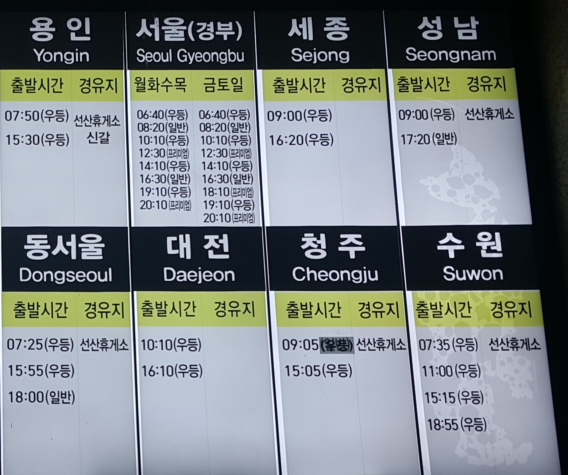 사상 출발 여수, 순천, 광주, 용인, 서울, 세종, 성남, 대전, 청주, 수원, 동서울 방면.