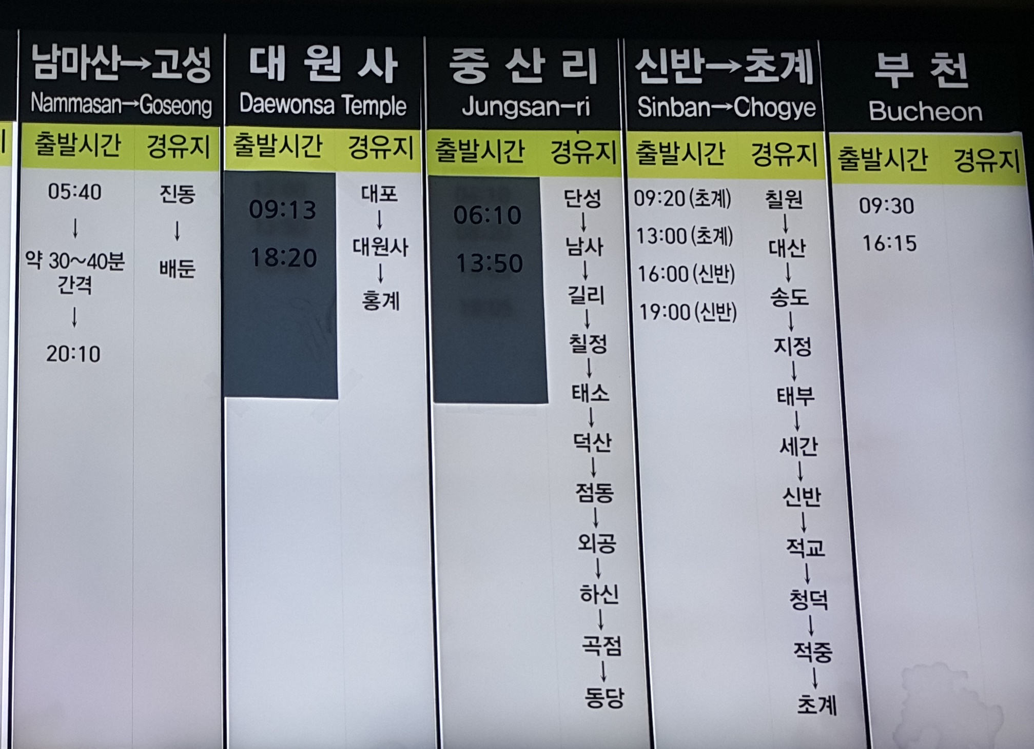 사상 출발 남마산, 고성, 대원사, 중산리, 신반, 초계, 부천 방면.