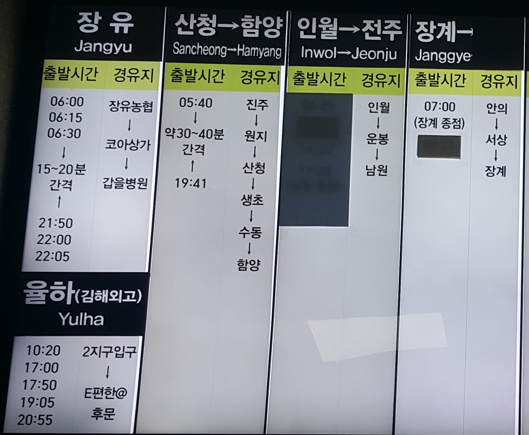 사상 출발 장유, 율하(김해외고), 산청, 함양, 인원, 전주, 장계 방면.