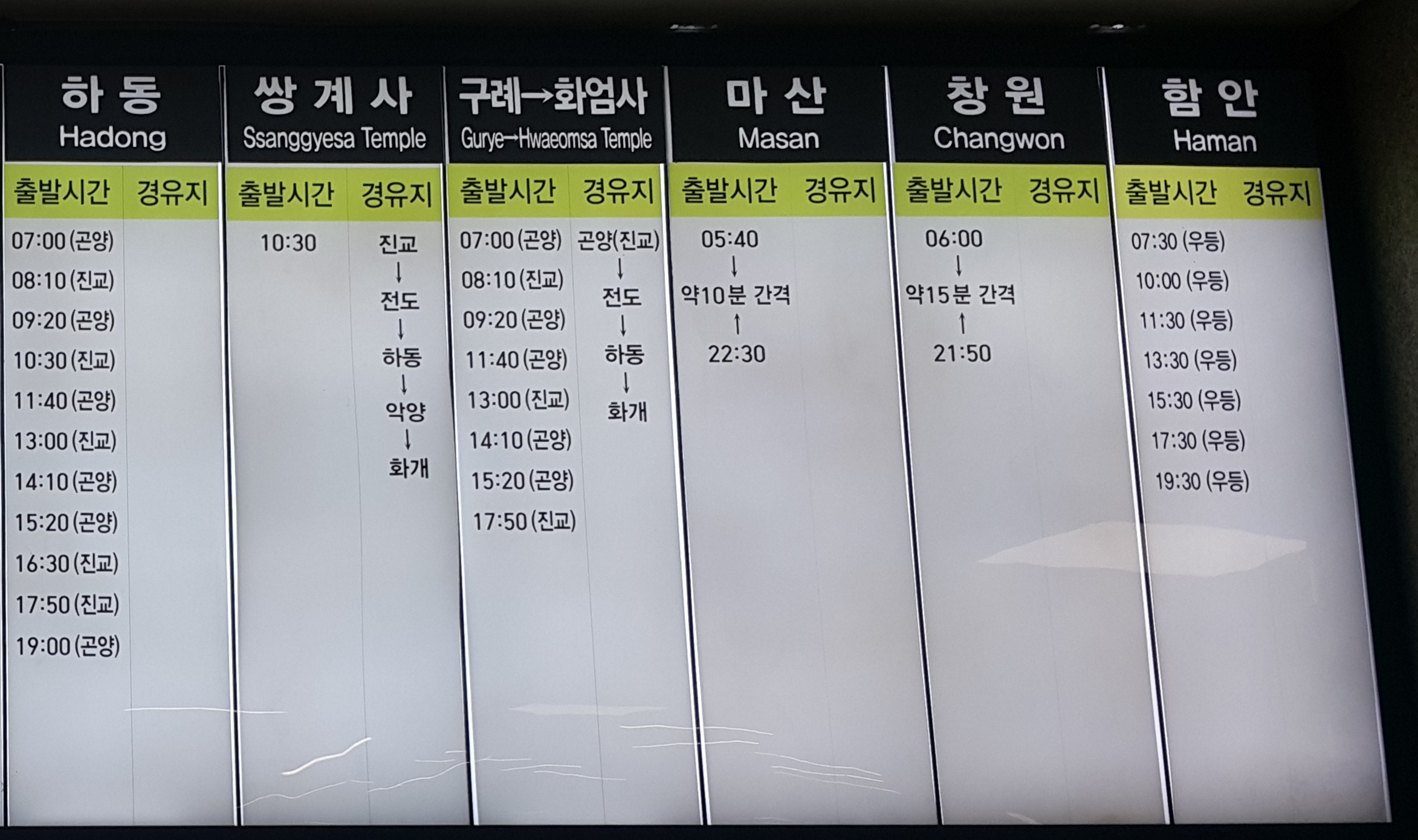 사상 출발 남마산, 고성, 대원사, 중산리, 신반, 초계, 부천 방면.