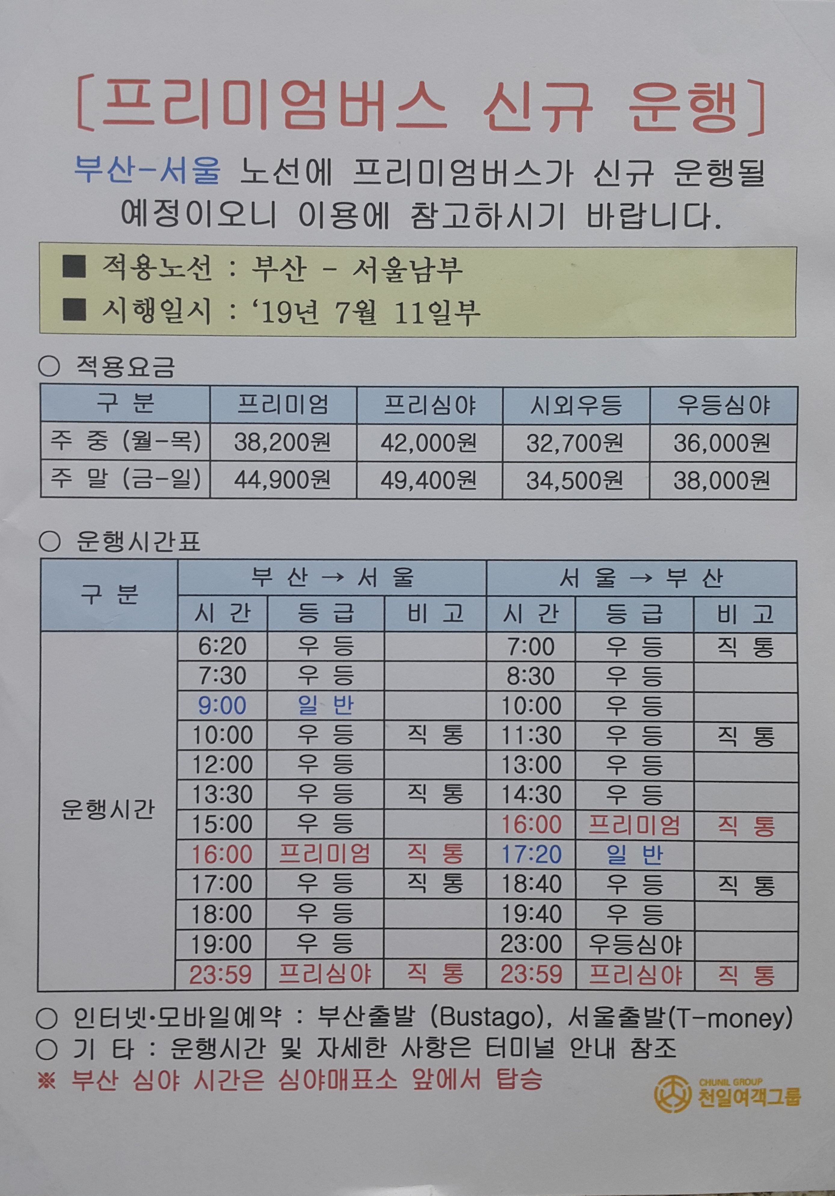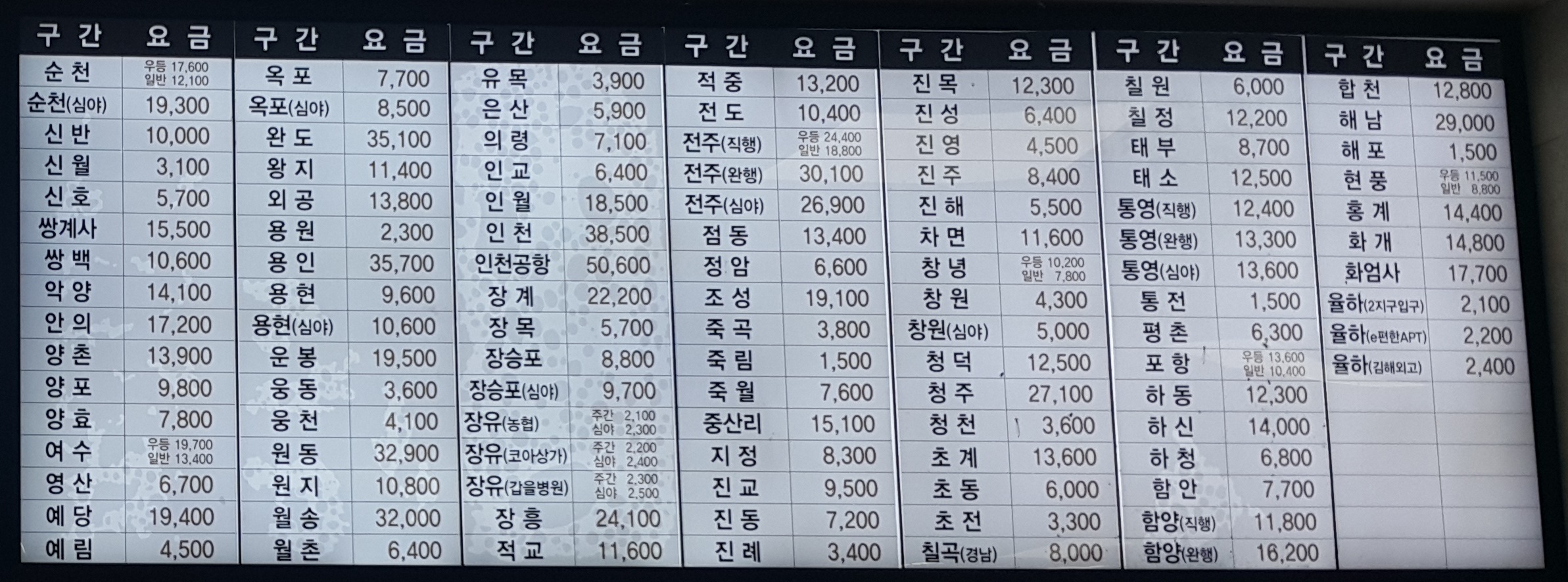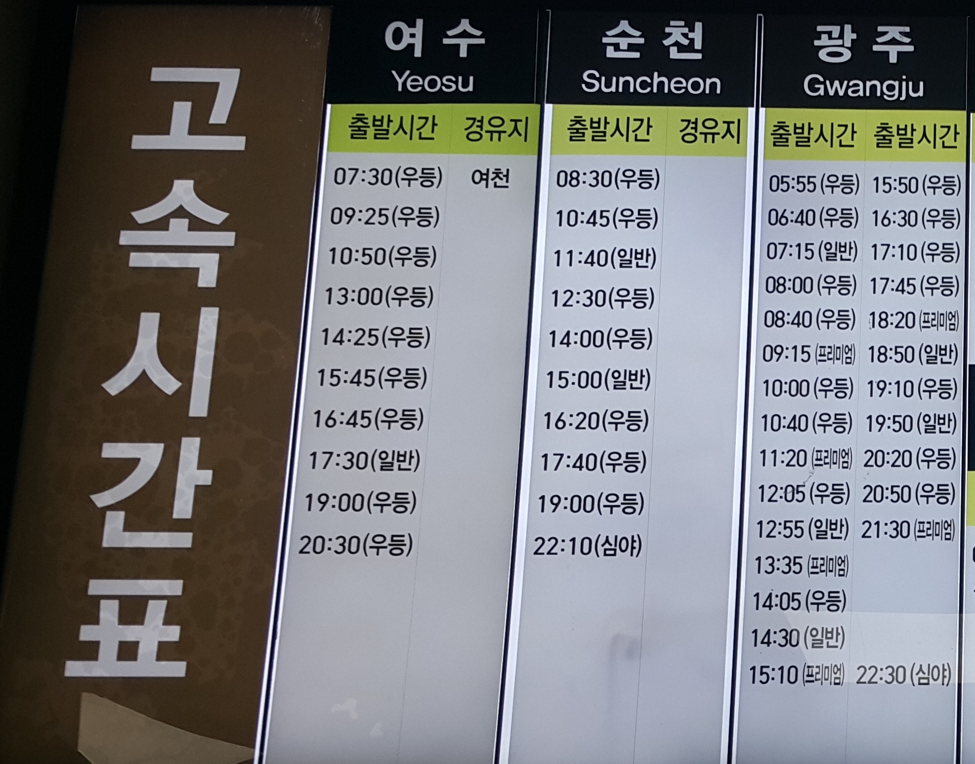 사상 출발 여수, 순천, 광주, 용인, 서울, 세종, 성남, 대전, 청주, 수원, 동서울 방면.