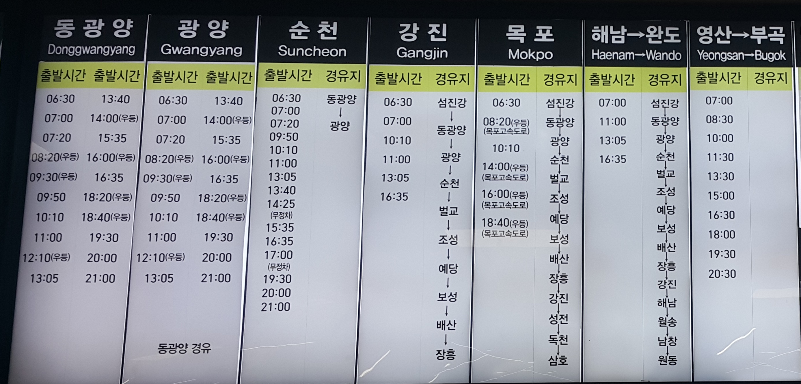 사상 출발 동광양, 광양, 순천, 강진, 목포, 해남, 완도, 영산, 부곡 방면.