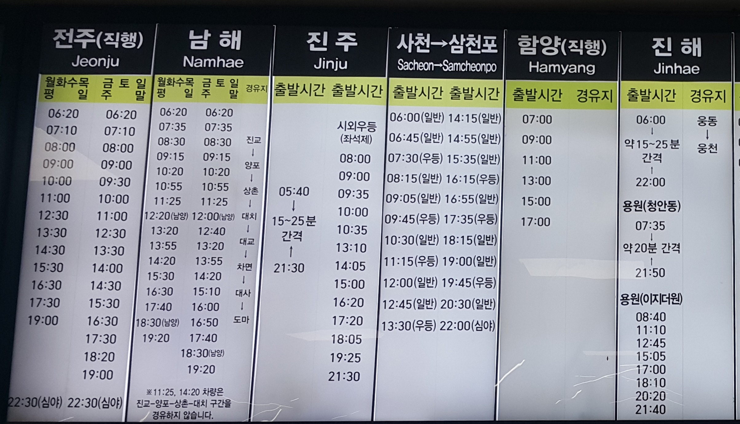 사상 출발 전주, 남해, 진주, 사천, 삼천포, 함양, 진해 방면.