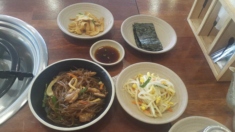 반찬은 잡채, 어묵, 콩나물, 김입니다.